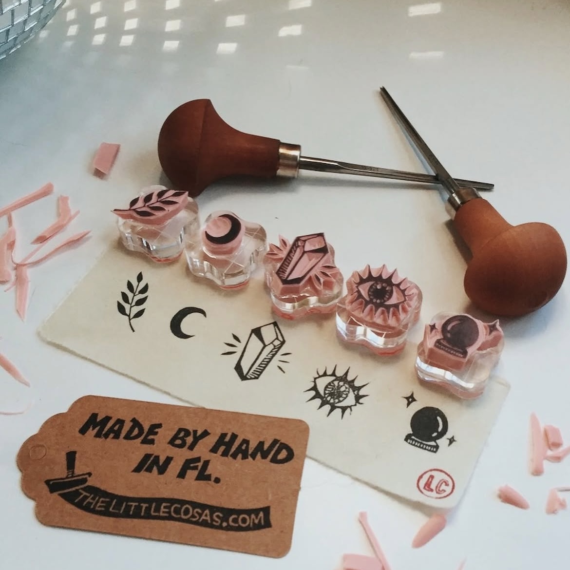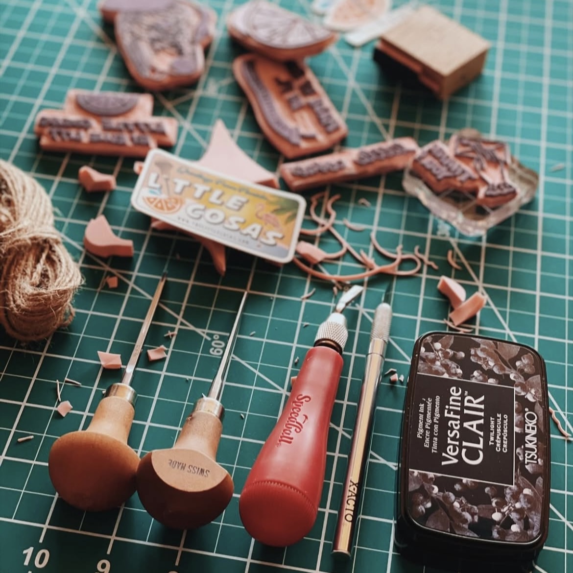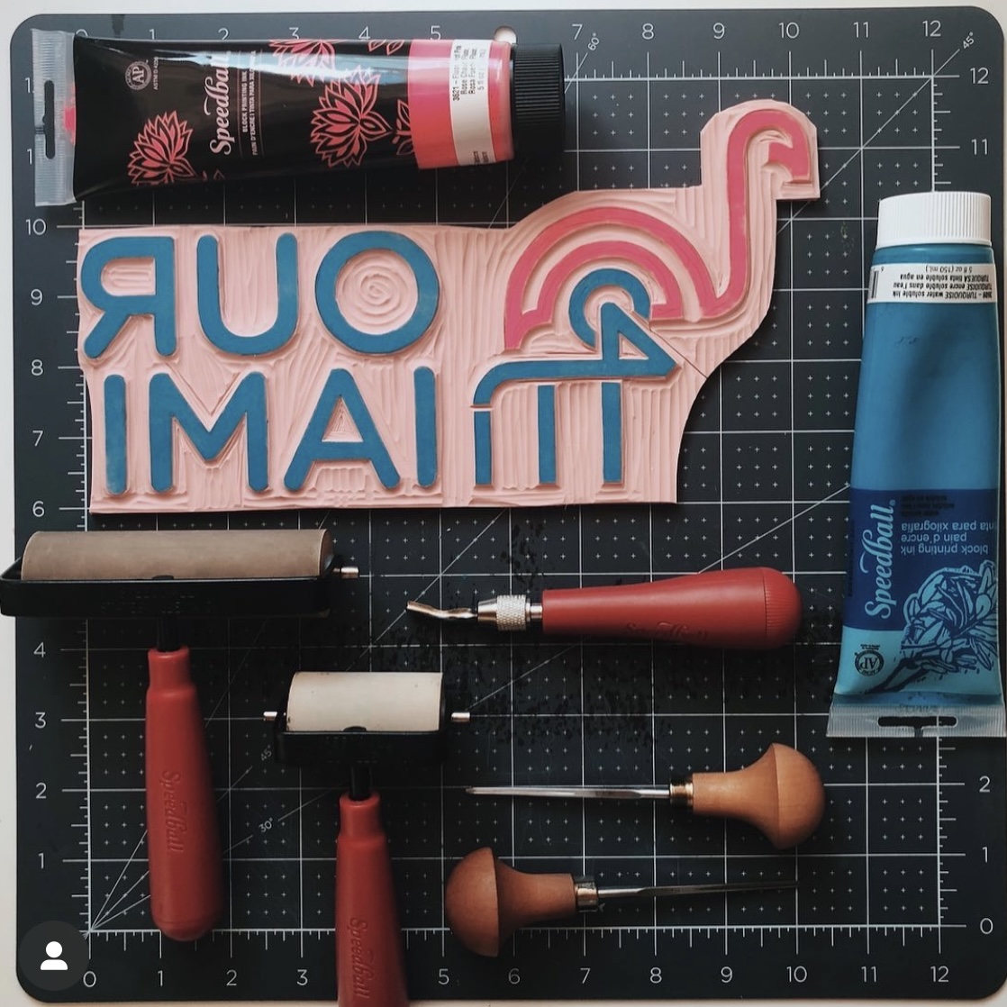Printmaking is an art form where a design is carved or etched into a flat surface like wood, metal, rubber or glass. The surface is then inkedβ similar to a stamp, and pressed onto a material, such as paper or fabric, to create a print of the design.