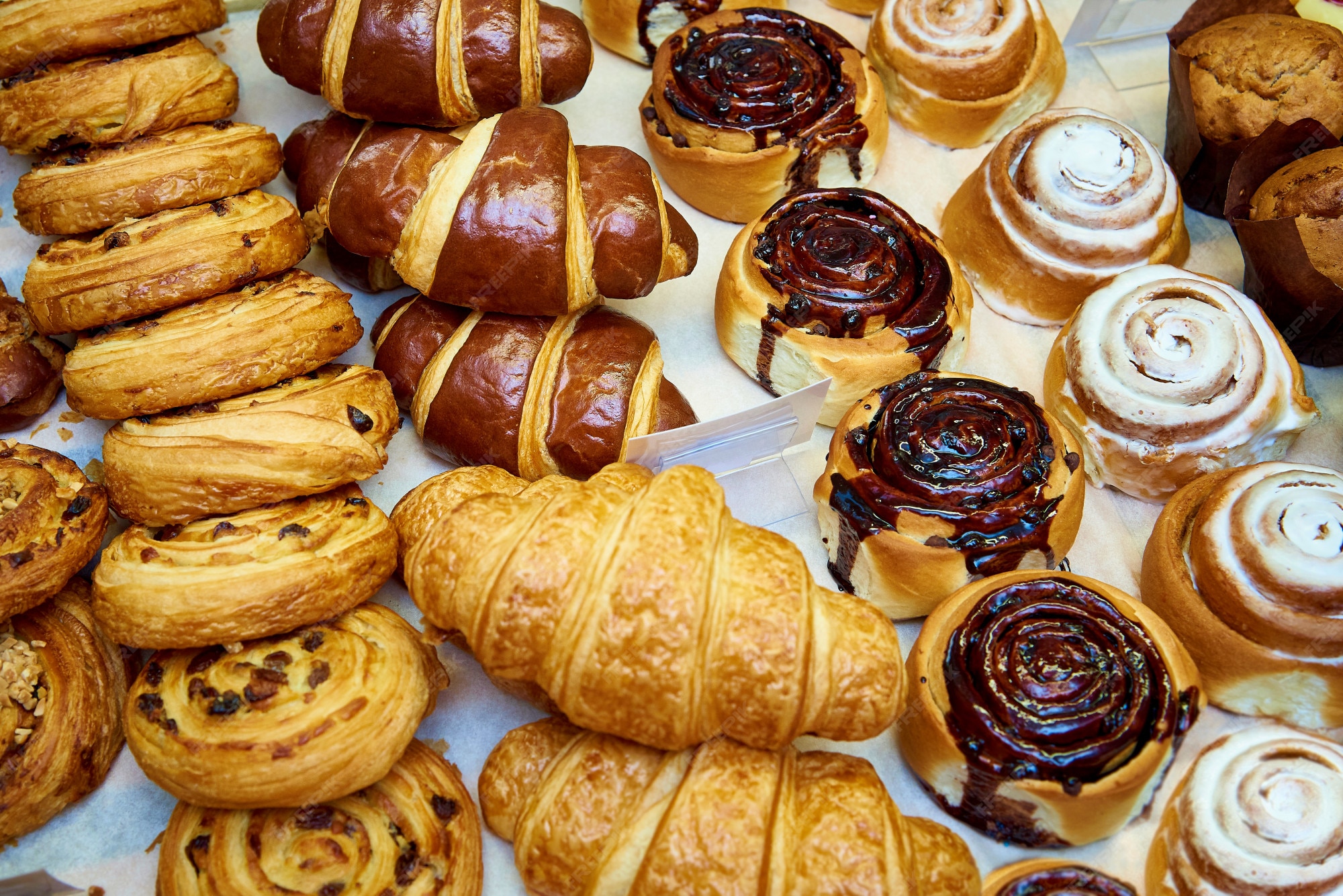 Pastry refers to a variety of doughs, as well as the sweet and savoury baked goods made from them. The dough may be accordingly called pastry dough for clarity. Sweetened pastries are often described as baker's confectionery. Common pastry dishes include pies, tarts, quiches, croissants, and turnovers. The French word pâtisserie is also used in English for many of the same foods, as well as the set of techniques used to make them.