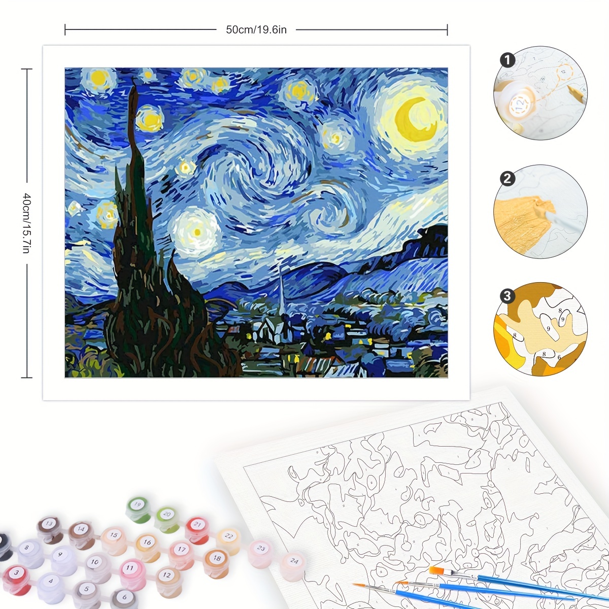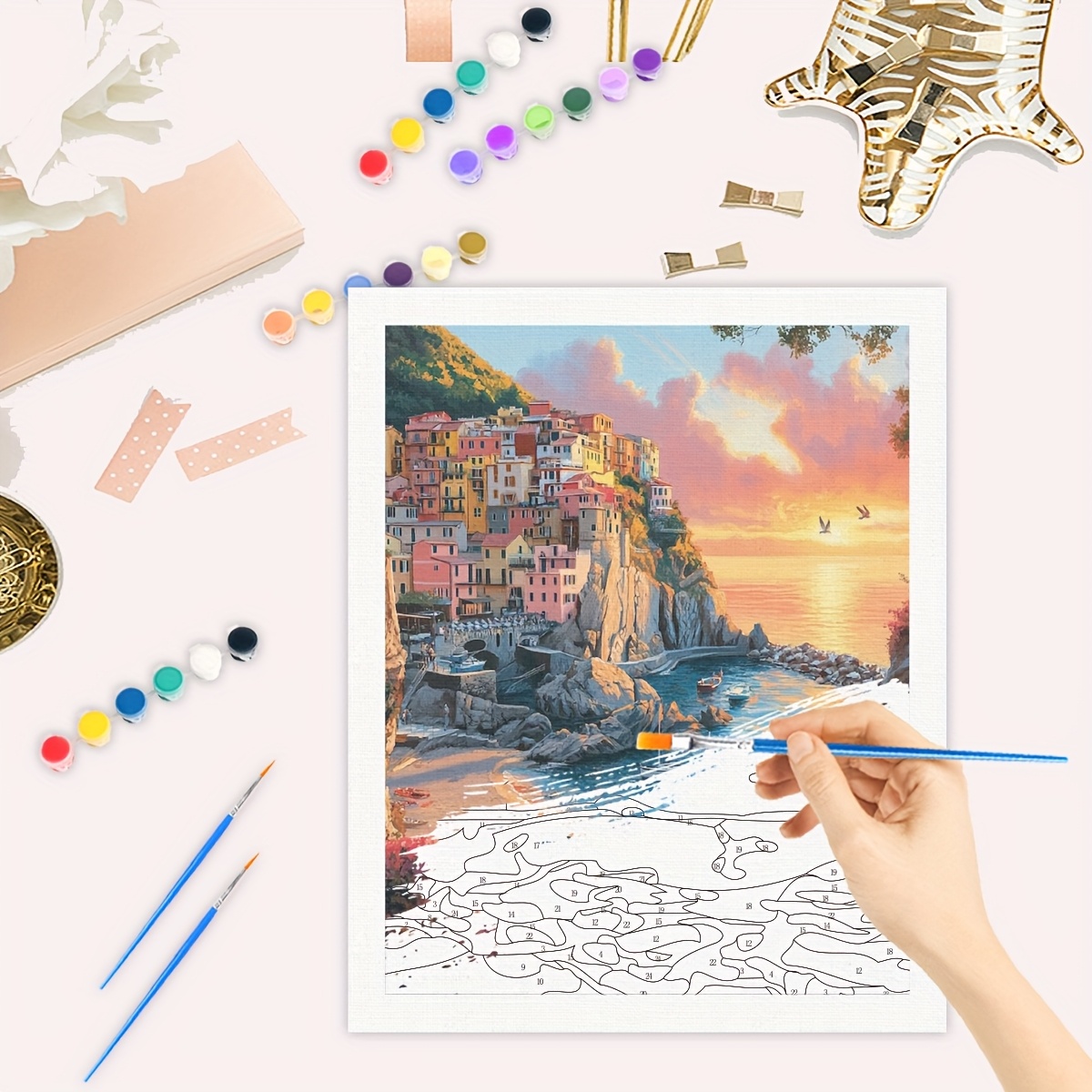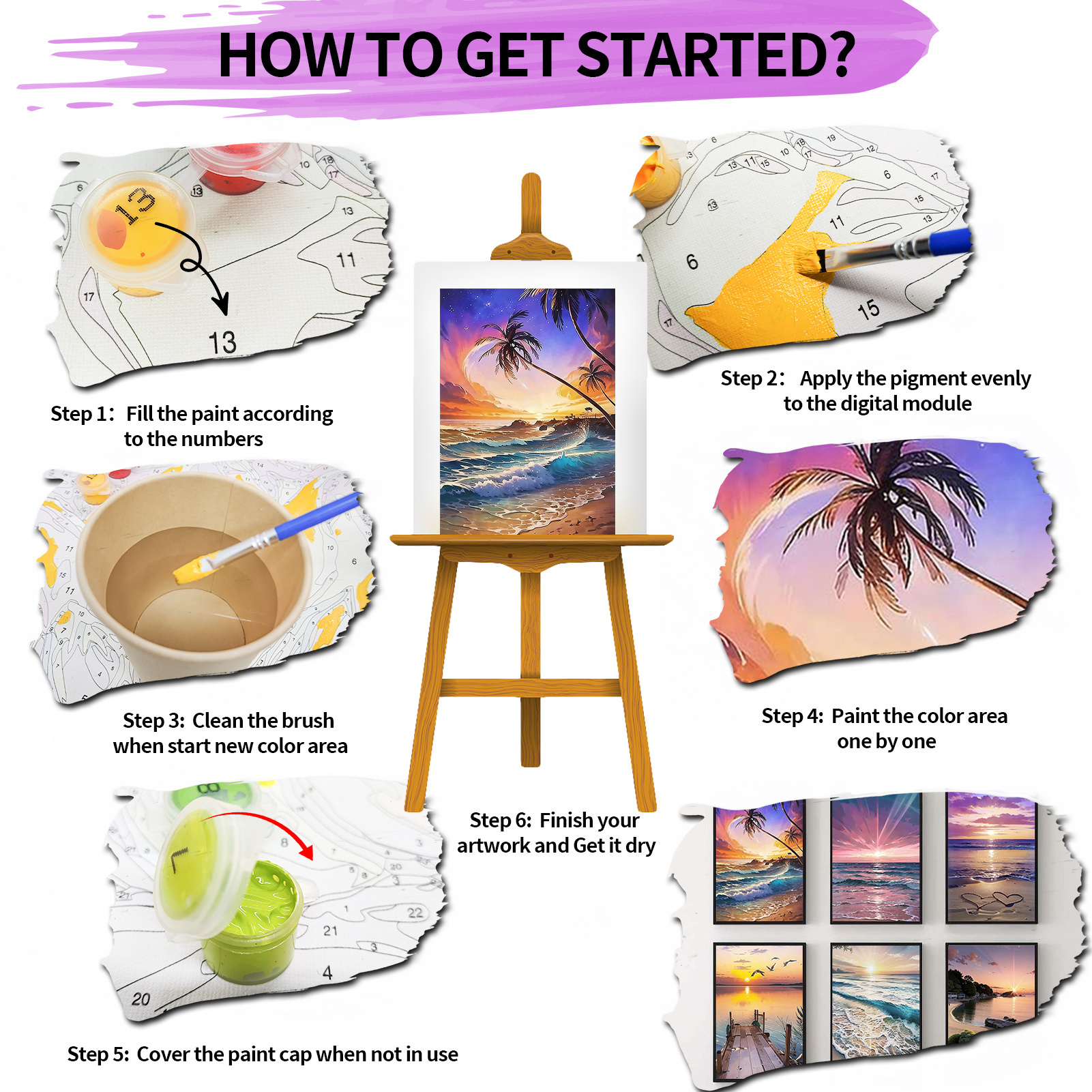 Paint by number or painting by numbers kits are self-contained painting sets, designed to facilitate painting a pre-designed image. They generally include brushes, tubs of paint with numbered labels, and a canvas printed with borders and numbers.