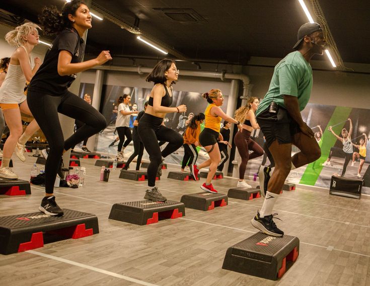Step aerobics is a rhythmic, high-intensity cardio workout that involves stepping up and down on a raised