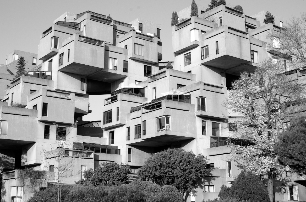 HABITAT 67, or simply Habitat, is a model community and housing complex in Montreal, Quebec, Canada, designed by Israeli-Canadian architect Moshe Safdie. It was originally conceived as his master's thesis at the School of Architecture at McGill University and then built as a pavilion for Expo 67, the World's Fair held from April to October 1967. It is at 2600 Avenue Pierre-Dupuy on the Marc-Drouin Quay next to the Saint Lawrence River. Habitat 67 is widely considered an architectural landmark and one of the most recognizable buildings in both Montreal and Canada. Read more on Wikipedia.