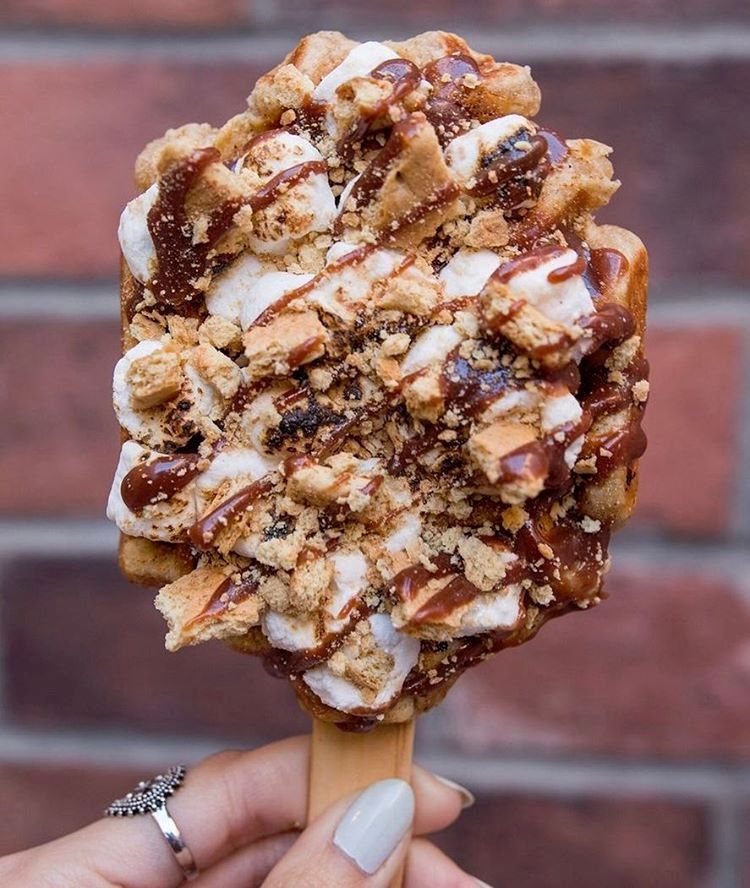 CHOCOLATE FLAVORED WAFFLE POP WITH CARAMEL COFFEE DRIZZLE AND MARSHMELLOW PIECES