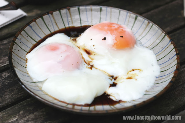 The 2 warm eggs are soft-boiled and served whole. So, you would just crack them open into a dish, and add dark soya sauce and white pepper to taste. Many people like to dip their kaya toast in the plates of eggs.