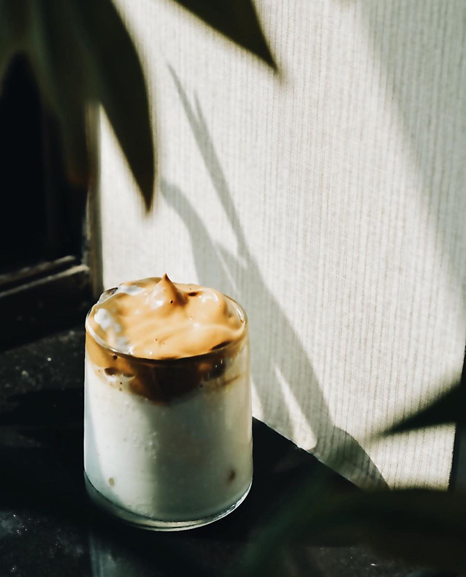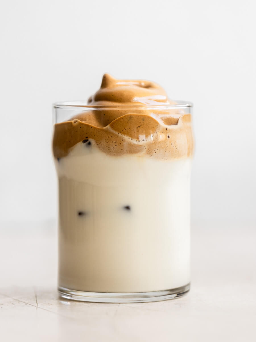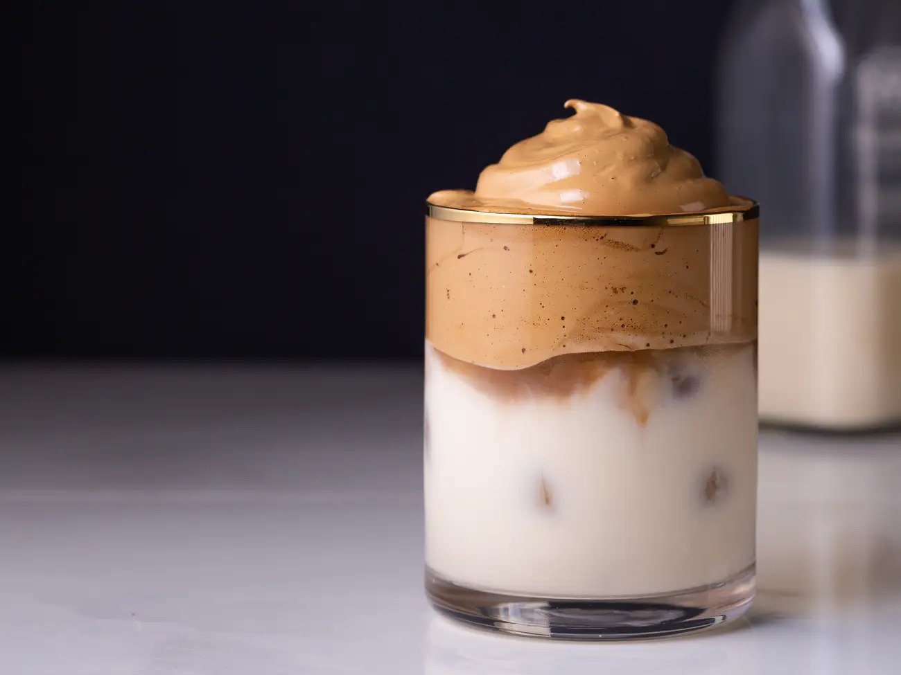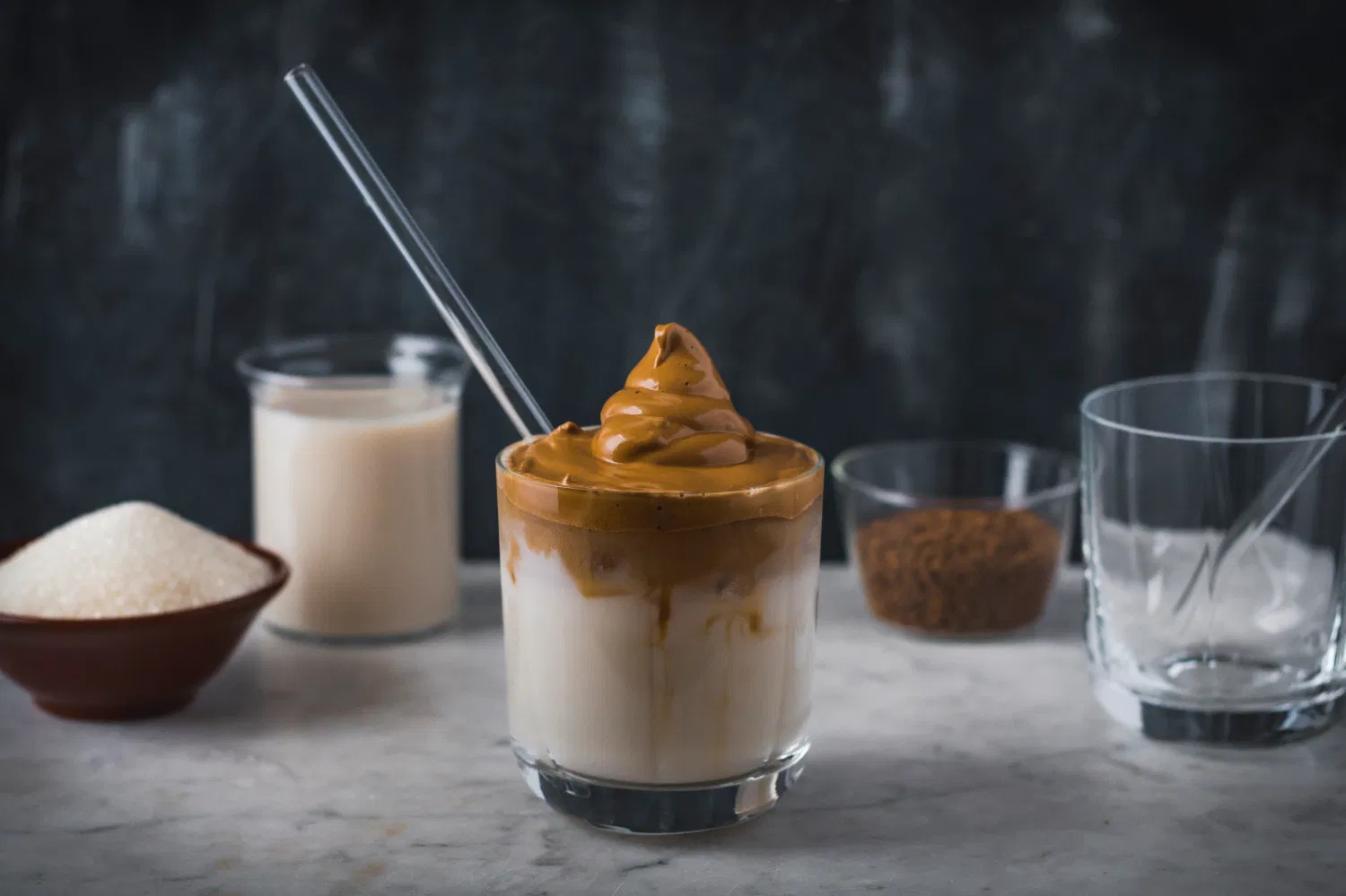 dalgona coffee, a white and tan beverage with a milky base, topped with a mixture of instant coffee, sugar,