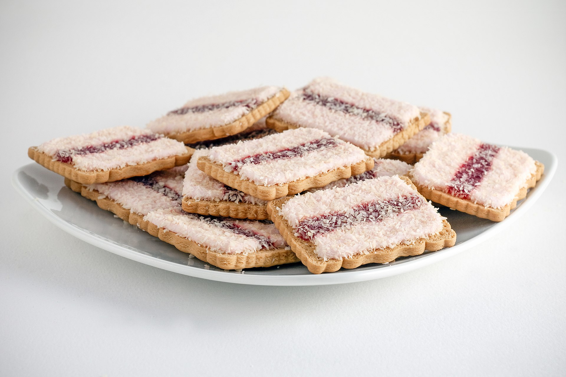 An Iced VoVo is a wheat flour biscuit topped with 2 strips of pink fondant flanking a strip of raspberry jam and sprinkled with coconut.It is a product of the Australian-based biscuit company Arnott's (now American-owned). Previously known as Iced Vo-Vo biscuits, the brand was first registered in 1906. On 24 November 2007, Australian Prime Minister Kevin Rudd made a light-hearted mention of Iced VoVos in his election victory speech, jokingly urging his team to have a strong cup of tea with an Iced VoVo before getting to work.This reportedly led to skyrocketing Iced VoVo sales, prompting Arnott's to send a shipping pallet of the biscuits to the Prime Minister's office in Canberra's New Parliament House. A similar product (called Mikado) has been sold in Ireland by Jacob's since 1888. It has pink marshmallow instead of pink fondant. But during the late 1980s and early 1990s there was a square shaped biscuit called Camelot.