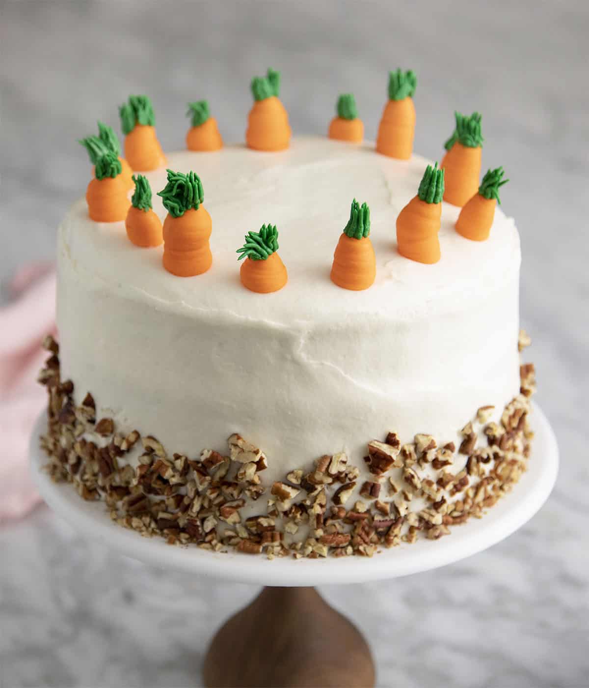 Top this classic carrot cake with moreish icing and chopped walnuts or pecans. Serve as a sweet treat with a cup of tea any time of the day.
