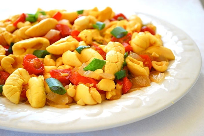 To prepare the dish, saltfish also known as cod fish is sautéed with boiled ackee, onions, Scotch Bonnet peppers, tomatoes and spices (black pepper, all-purpose and jerk seasoning). It is usually served as breakfast or dinner alongside breadfruit, hard dough bread, dumplings, fried plantain, or boiled green bananas. Ackee and Saltfish can also be eaten with rice and peas or plain white rice.