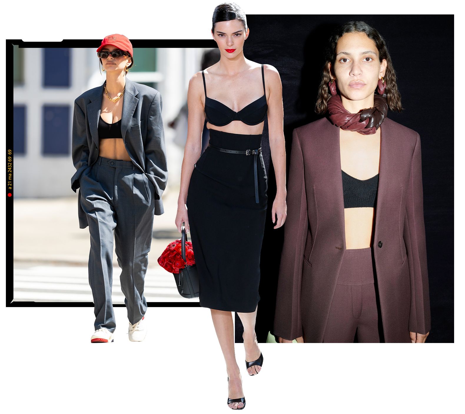 Whether office casual is getting very liberal at your current workplace, or you're ready to turn up your suit look for an evening out, a bra top is the best way to infuse a little modernity into your tailored separates. Try it with oversized suiting like Emily Ratajkowski, with a sleek pencil skirt as seen at Michael Kors, or paired with a somber shade à la Jil Sander.