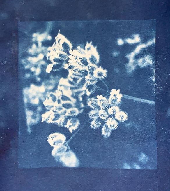 Cyanotypes are a traditional photo process dating back to 1842. First invented by Sir John F. W. Herschel, the process combines ferric ammonium citrate and potassium ferricyanide, also known as Prussion blue, into a solution that is coated onto fiberous material to dry in the dark. The paper or cloth is then exposd using the sun to create an image. This process requires UV light for exposure, unlike other photographic processes that are sensitive to artificial light, making cyanotypes a unique process based photographic printmaking art. Above is a photo of Poison Hemlock (Conium maculatum) in fruiting stage taken with iphone xs June 2020, printed on 100% cotton rag paper using traditional cyanotype methods summer 2021