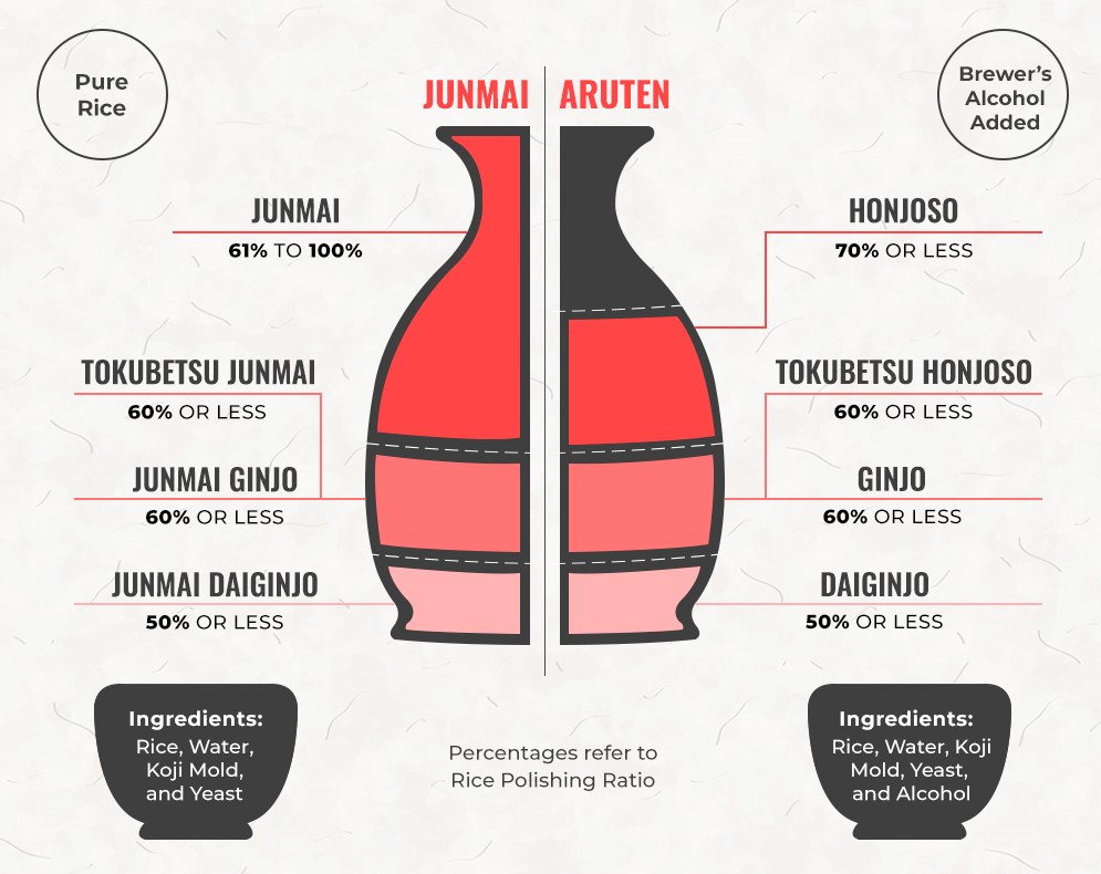 There are eight legally defined grades of premium sake. An important factor in deciding the grade of sake is the milling ratio of the rice, known as seimaibuai (精米歩合). This is a number you will see on every bottle of premium sake, indicating the remaining portion of the rice kernel after it is milled during production.