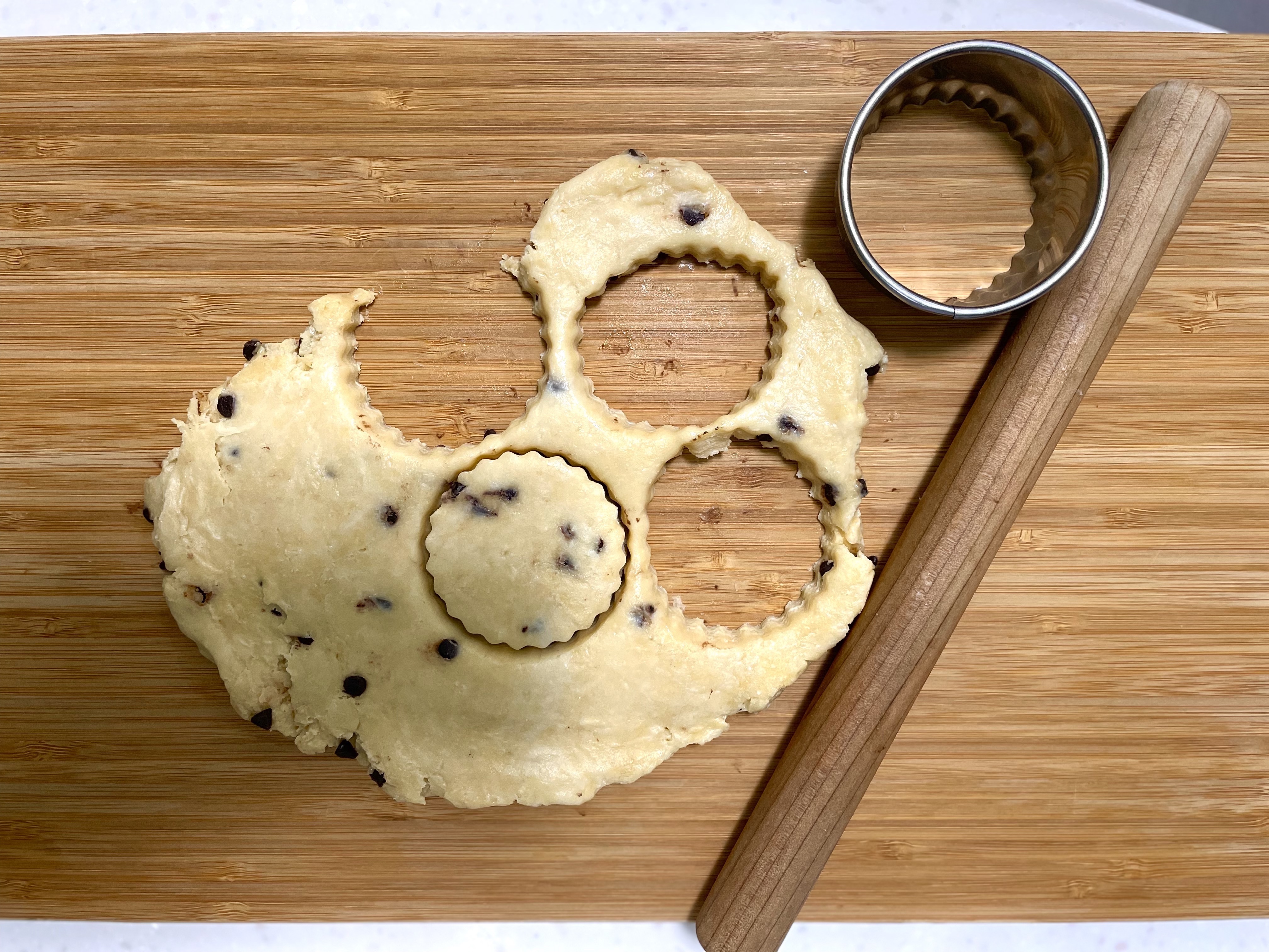 Scatter some flour onto the work surface and tip the dough out. Dredge the dough and your hands with a little more flour, then fold the dough over 2-3 times until it’s a little smoother. Pat into a round about 4cm deep. Take a 5cm cutter (smooth-edged cutters tend to cut more cleanly, giving a better rise) and dip it into some flour. Plunge into the dough, then repeat until you have four scones. You may need to press what’s left of the dough back into a round to cut out another four.