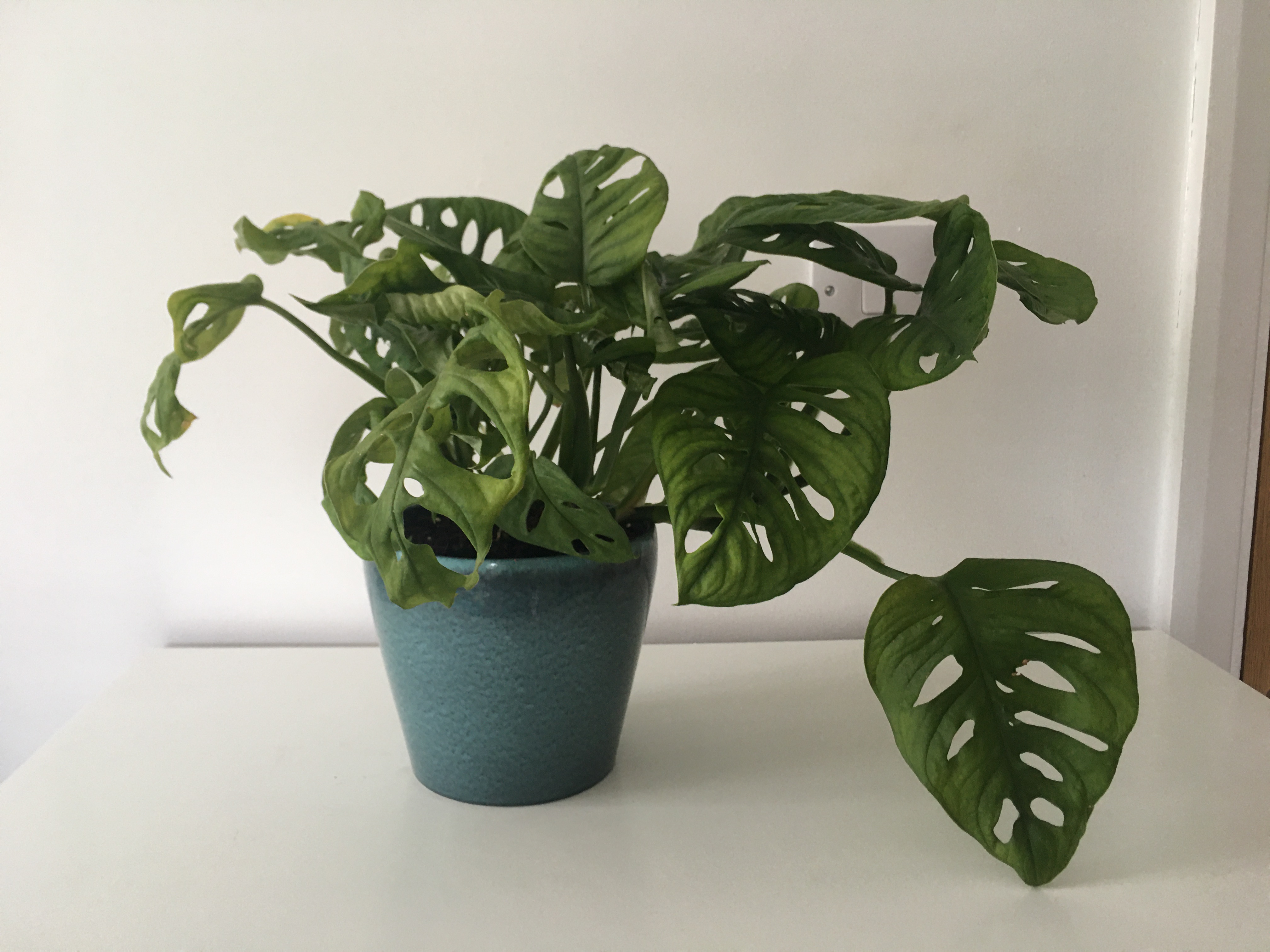 compared to the previous two but even more rewarding as it's always producing new leaves. Swiss cheese plants tend to enjoy lower, indirect light as too much bright light exposure will damage their leaves. You should water about once a week when the soil has dried out (fortnightly during the winter) and mist often to encourage leaf growth. You can probably see mine has had a bit too much light on one side, so he's been moved to a less bright spot to help him recover.