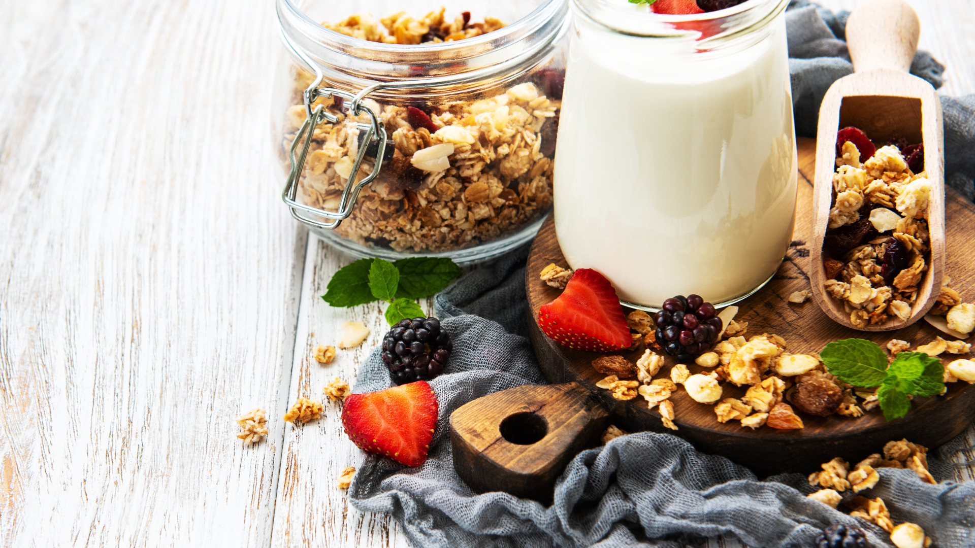 Granola is a breakfast and snack food consisting of rolled oats, nuts, honey or other sweeteners such as brown sugar, and sometimes puffed rice, that is usually baked until crisp, toasted and golden brown. During the baking process, the mixture is stirred to avoid burning and maintain a loose breakfast cereal consistency. Dried fruit, such as raisins and dates, and confections such as chocolate are sometimes added. Granola is often eaten in combination with yogurt, honey, fresh fruit (such as bananas, strawberries or blueberries), milk or other forms of cereal. It also serves as a topping for various pastries, desserts or ice cream.
