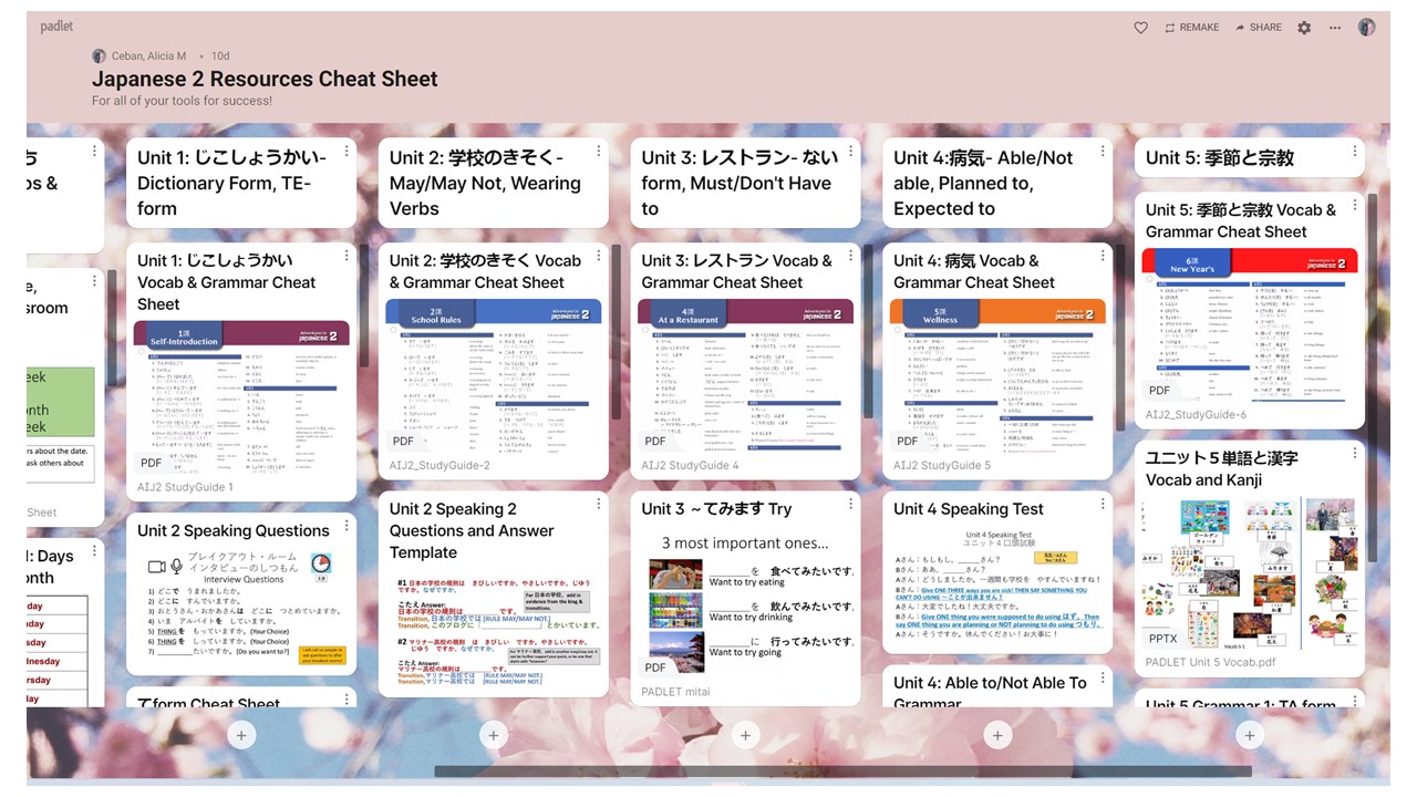 That's where Padlet came in! Using the column feature, I created a column for each Unit and added resources in jpeg, png and PDF format. I also ask