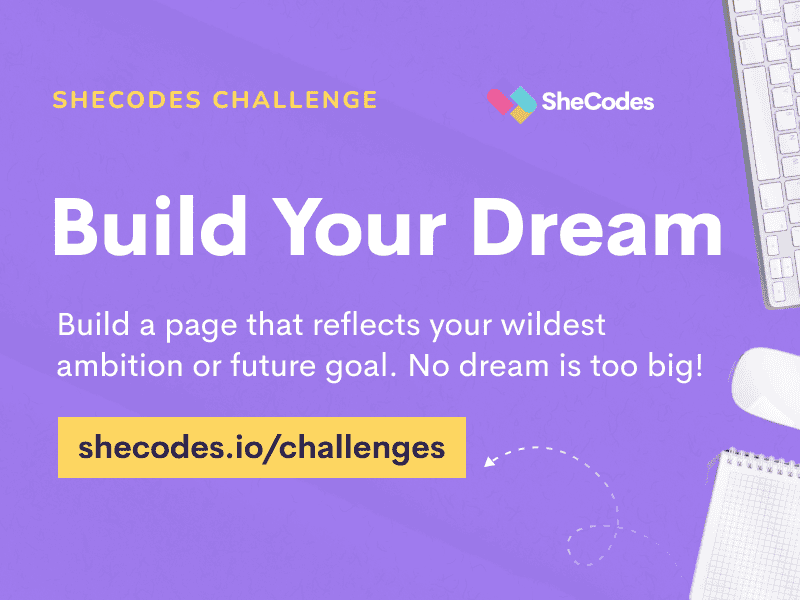SheCodes challenges are contests that we regularly launch so that you can practice your coding skills, gain exposure, and earn great prizes. The challenge involves building your own landing page from scratch!