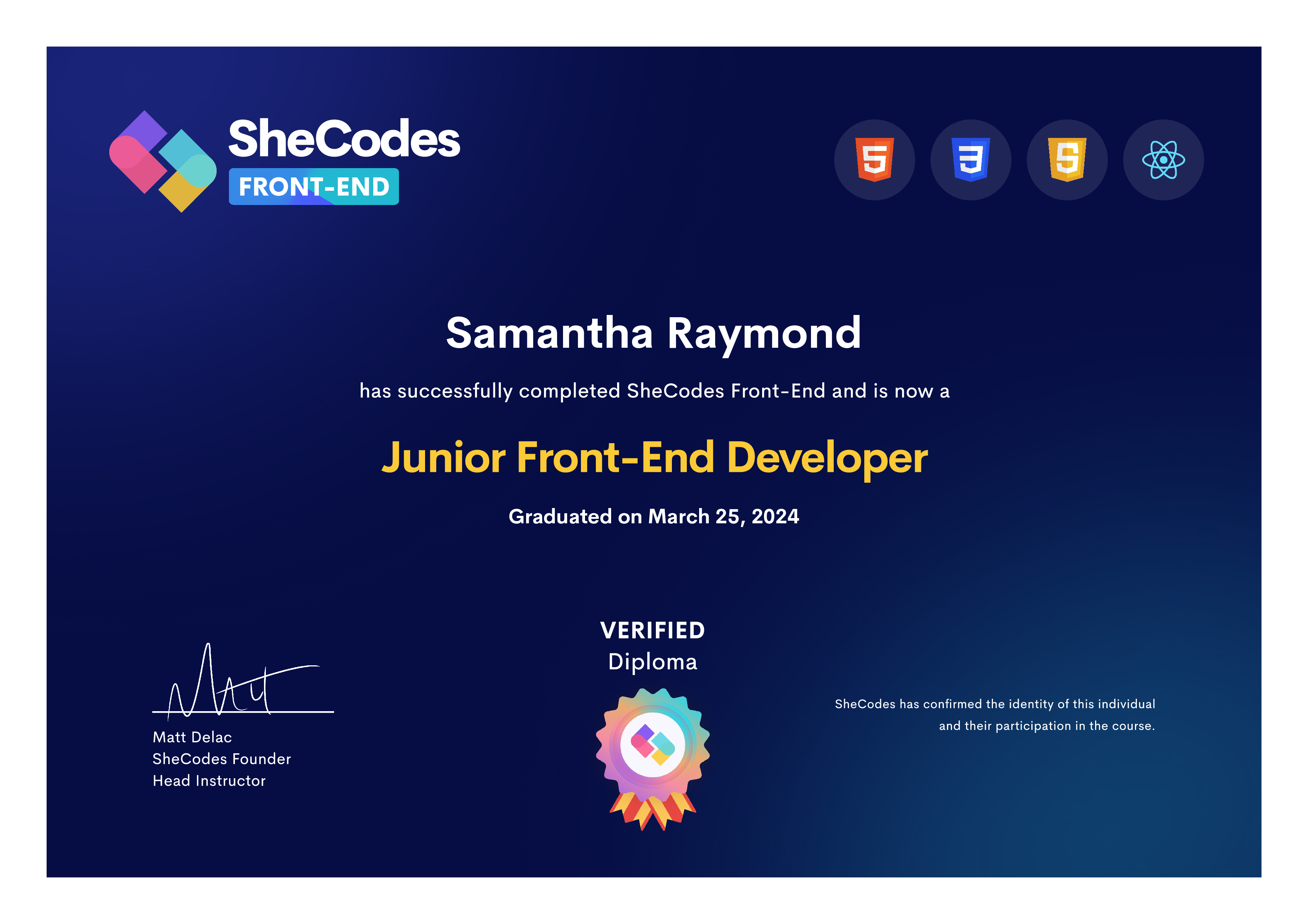 Samantha successfully graduated from at least one SheCodes Coding Workshop and is featured in the SheCodes Hall of Fame