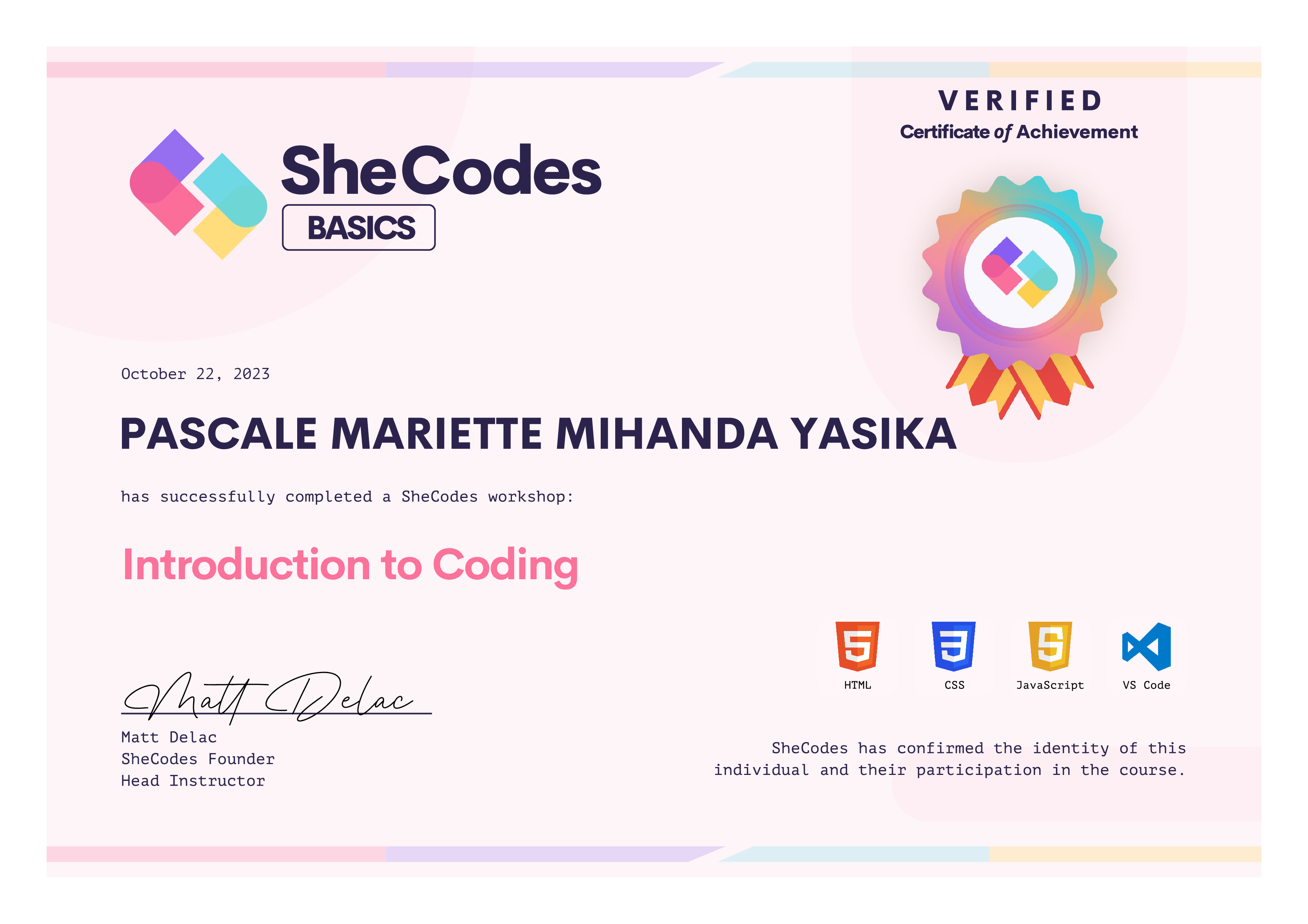 PASCALE MARIETTE successfully graduated from at least one SheCodes Coding Workshop and is featured in the SheCodes Hall of Fame