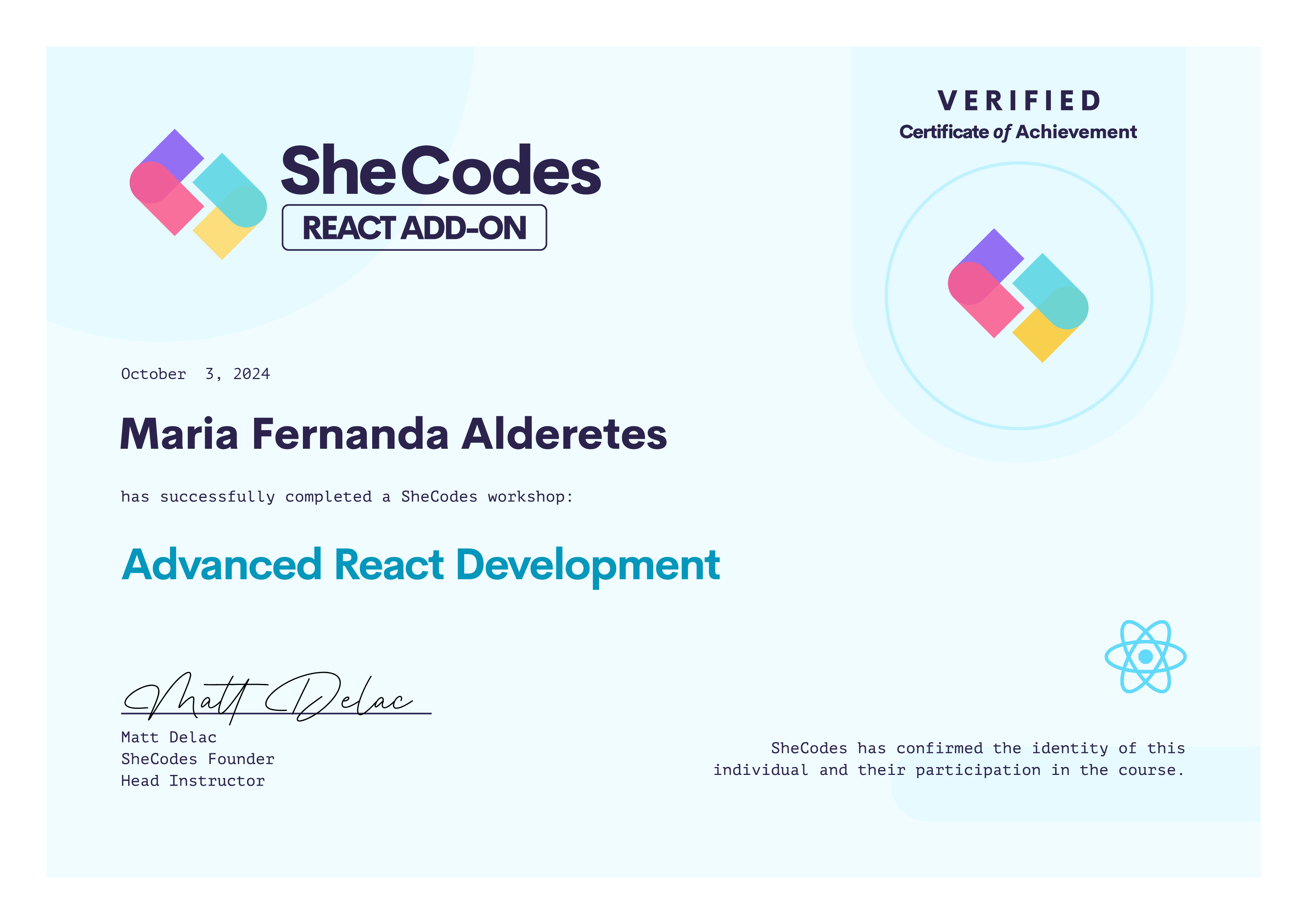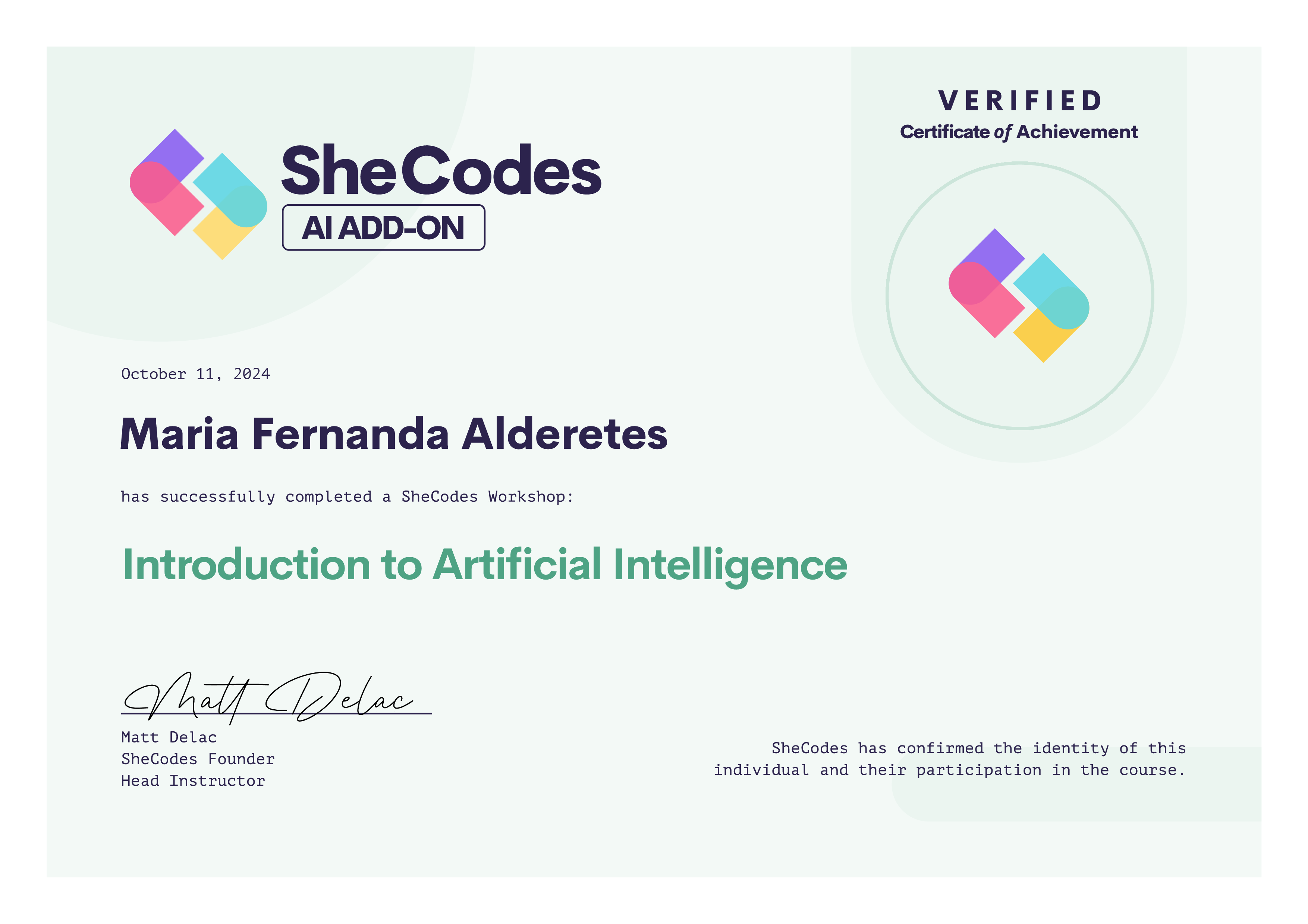 Maria Fernanda successfully graduated from at least one SheCodes Coding Workshop and is featured in the SheCodes Hall of Fame
