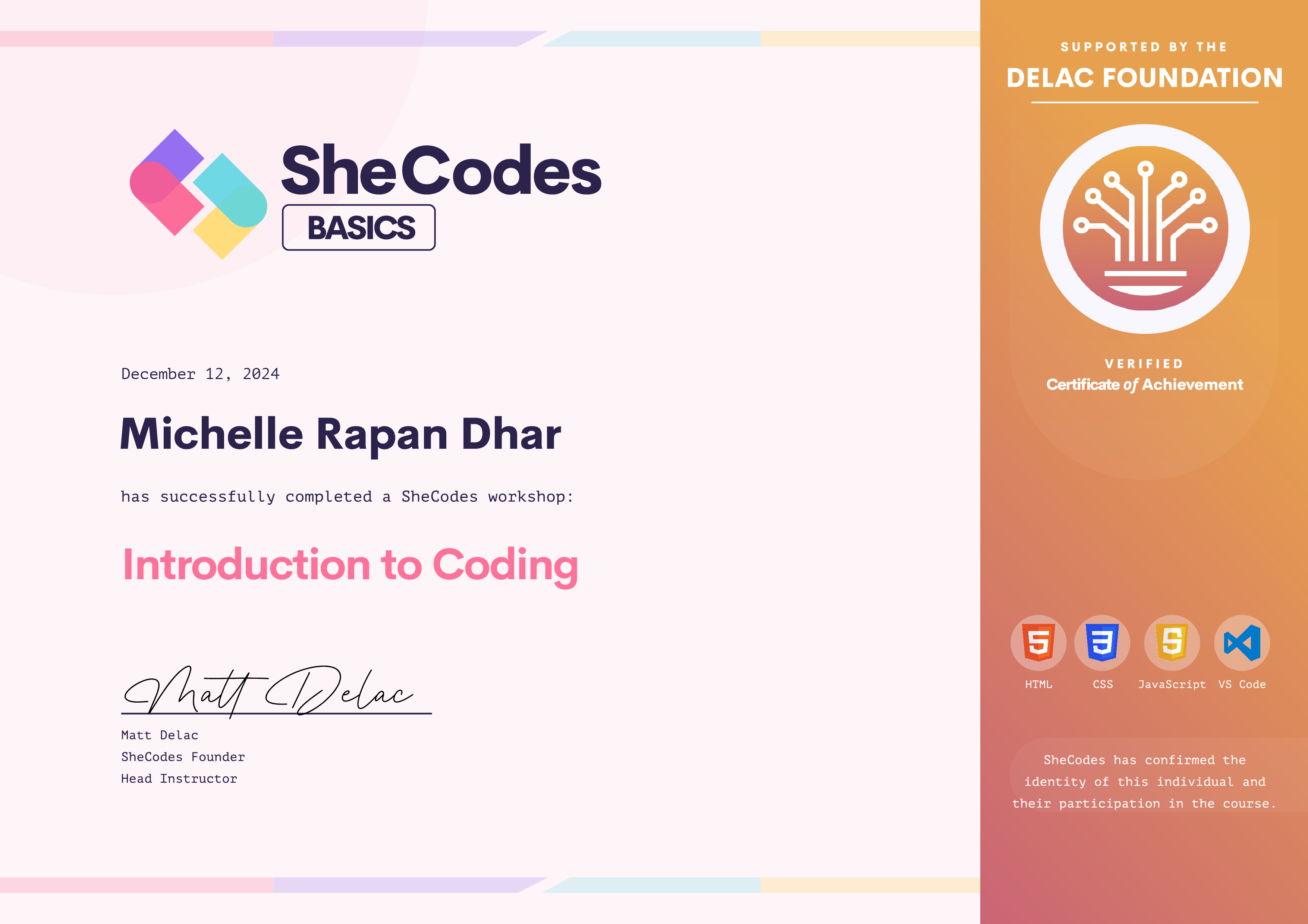 Michelle Rapan has been fully supported by the Delac Foundation to complete this SheCodes Workshop