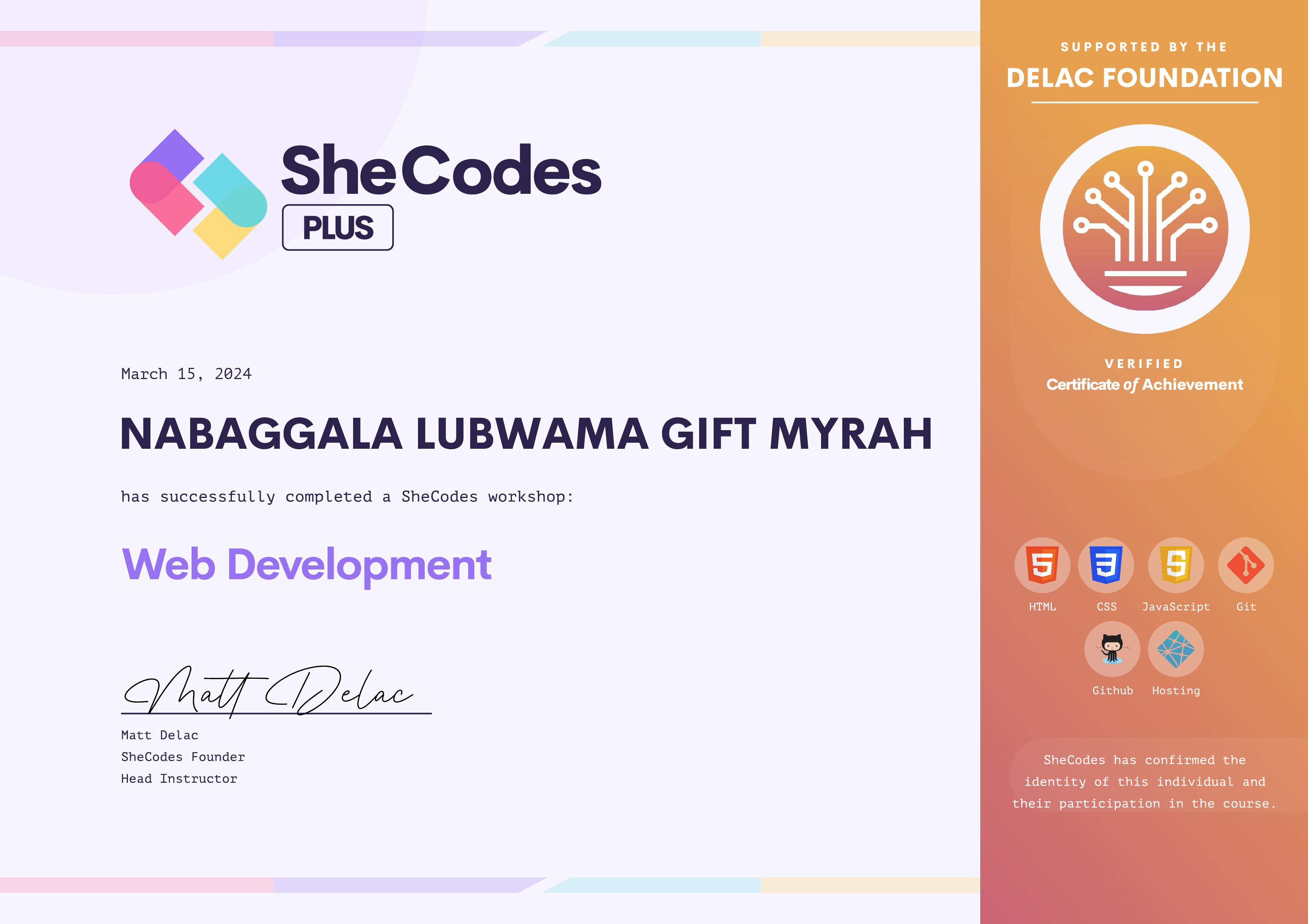 NABAGGALA has been fully supported by the Delac Foundation to complete this SheCodes Workshop
