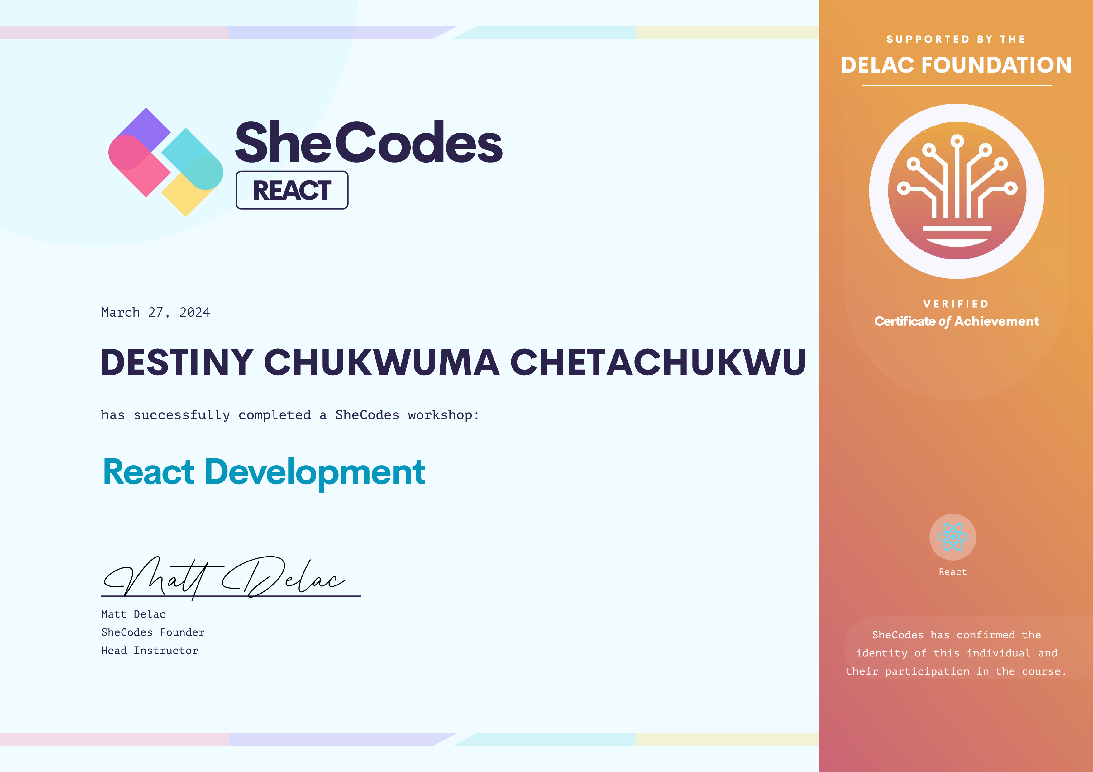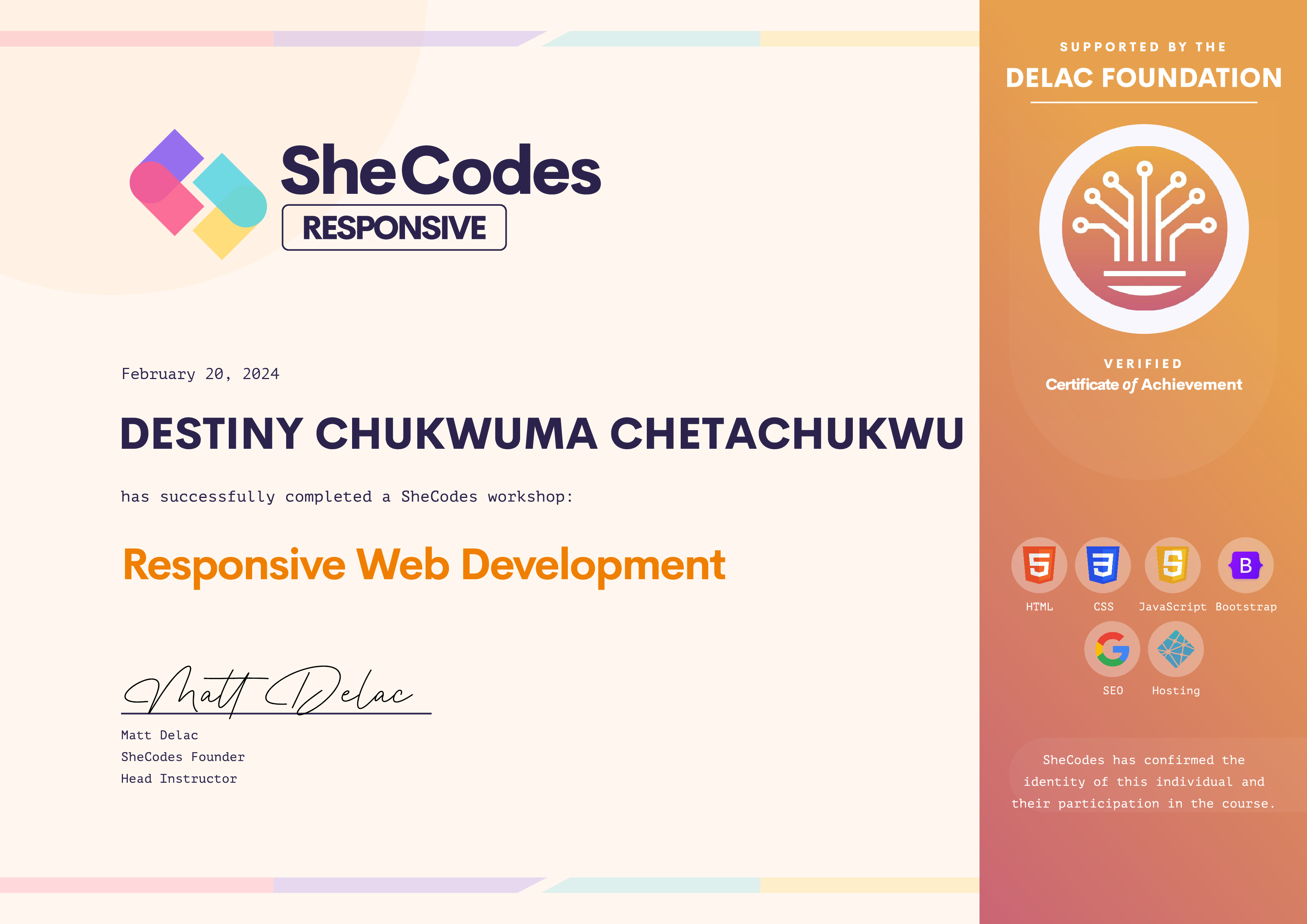 DESTINY successfully graduated from at least one SheCodes Coding Workshop and is featured in the SheCodes Hall of Fame