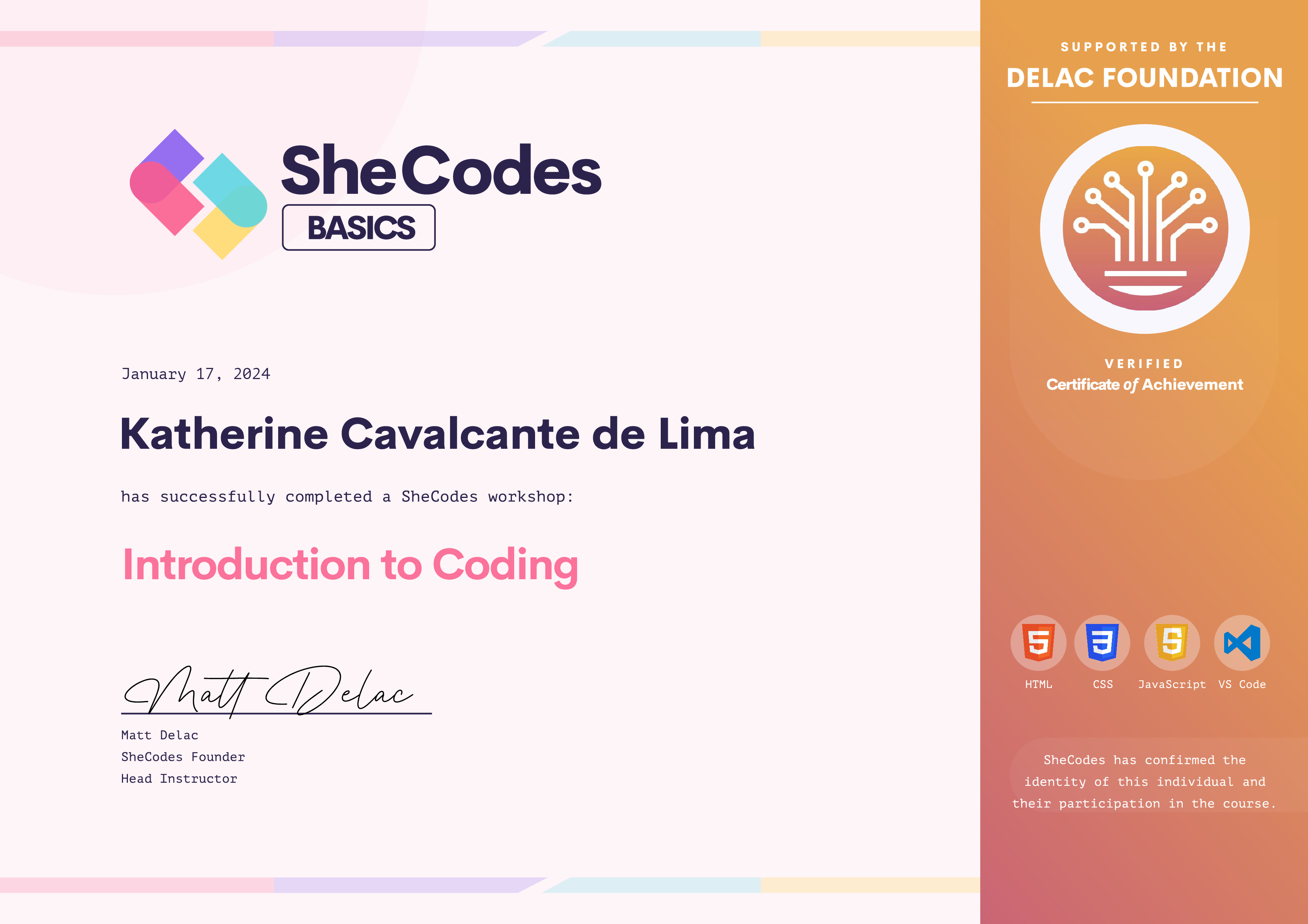 Katherine has been fully supported by the Delac Foundation to complete this SheCodes Workshop