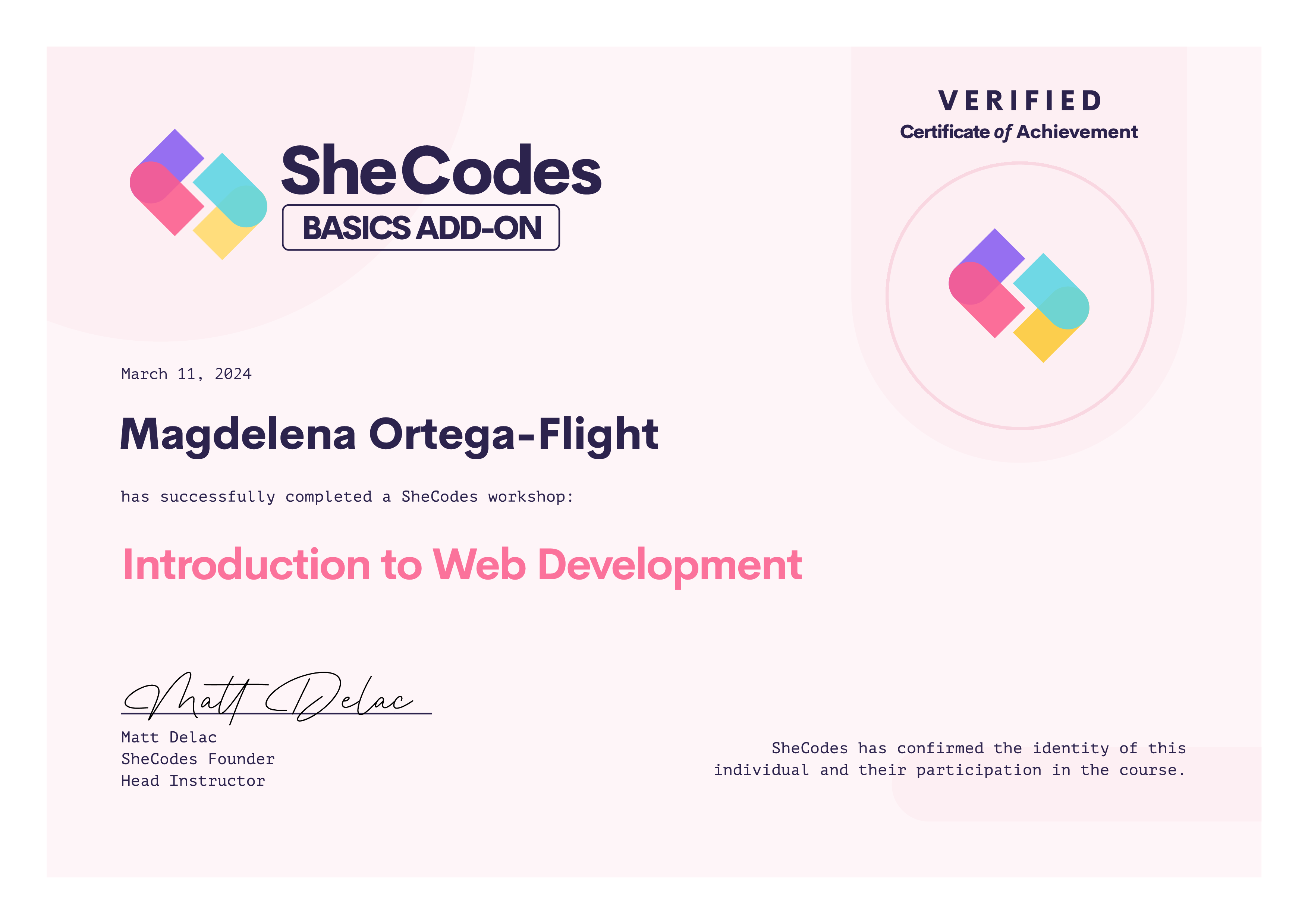 Magdelena successfully graduated from at least one SheCodes Coding Workshop and is featured in the SheCodes Hall of Fame