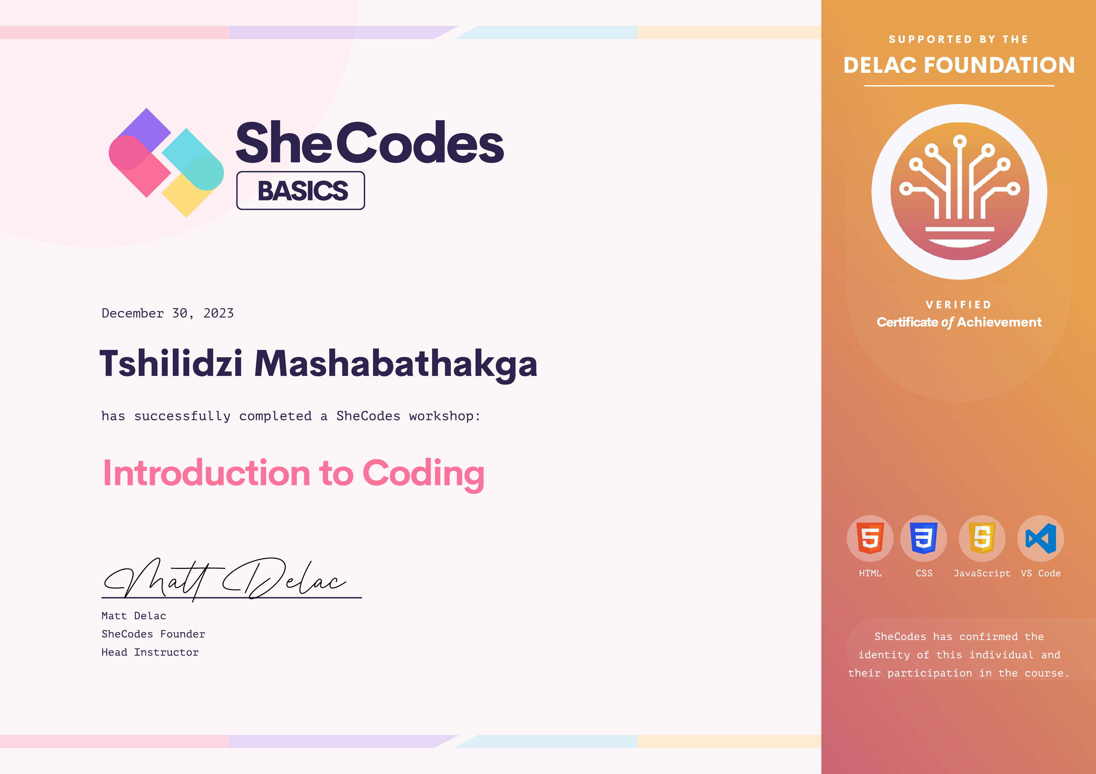 Tshilidzi has been fully supported by the Delac Foundation to complete this SheCodes Workshop