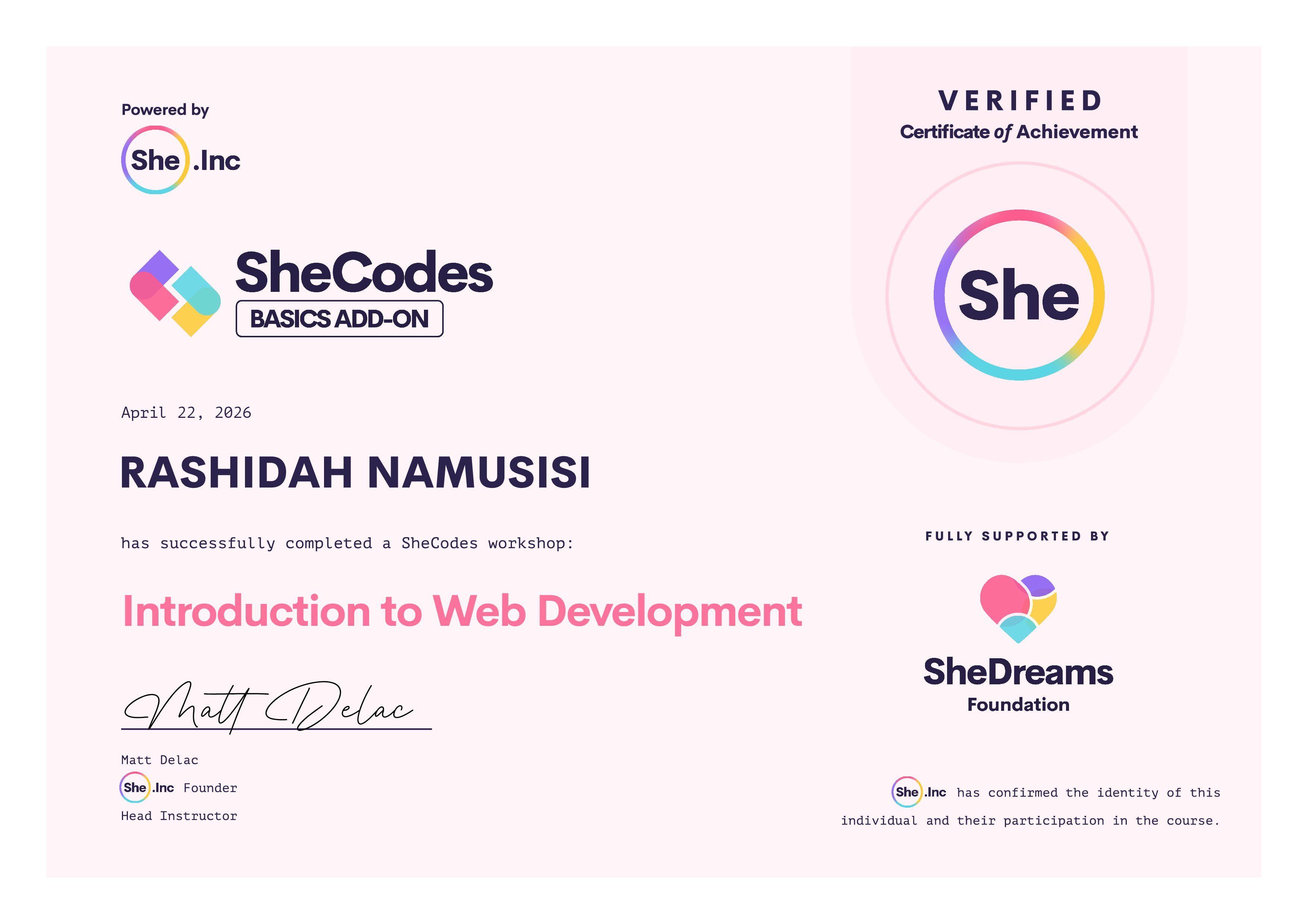 RASHIDAH has been fully supported by the The SheDreams Foundation to complete this SheCodes Workshop