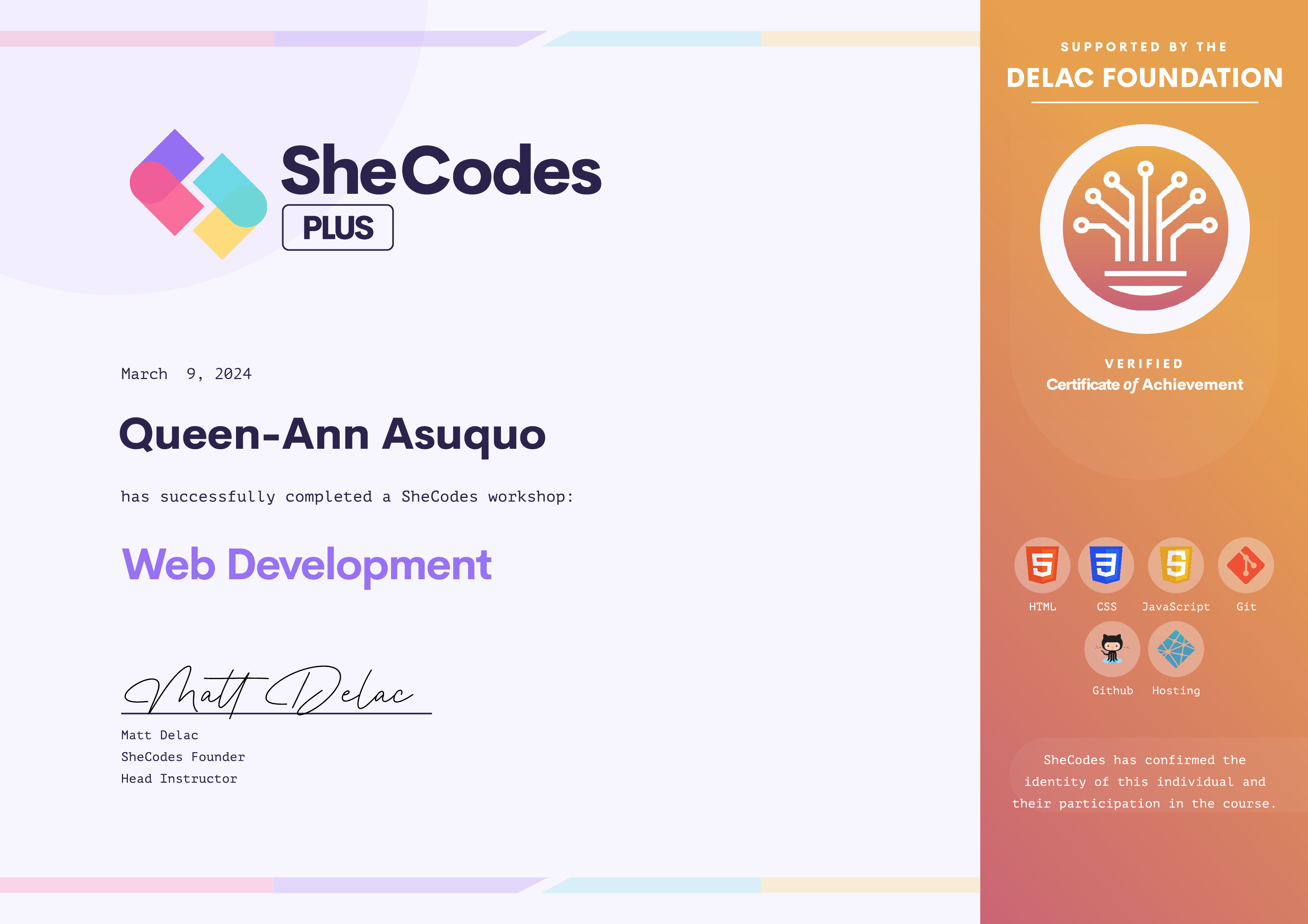 Queen-Ann successfully graduated from at least one SheCodes Coding Workshop and is featured in the SheCodes Hall of Fame