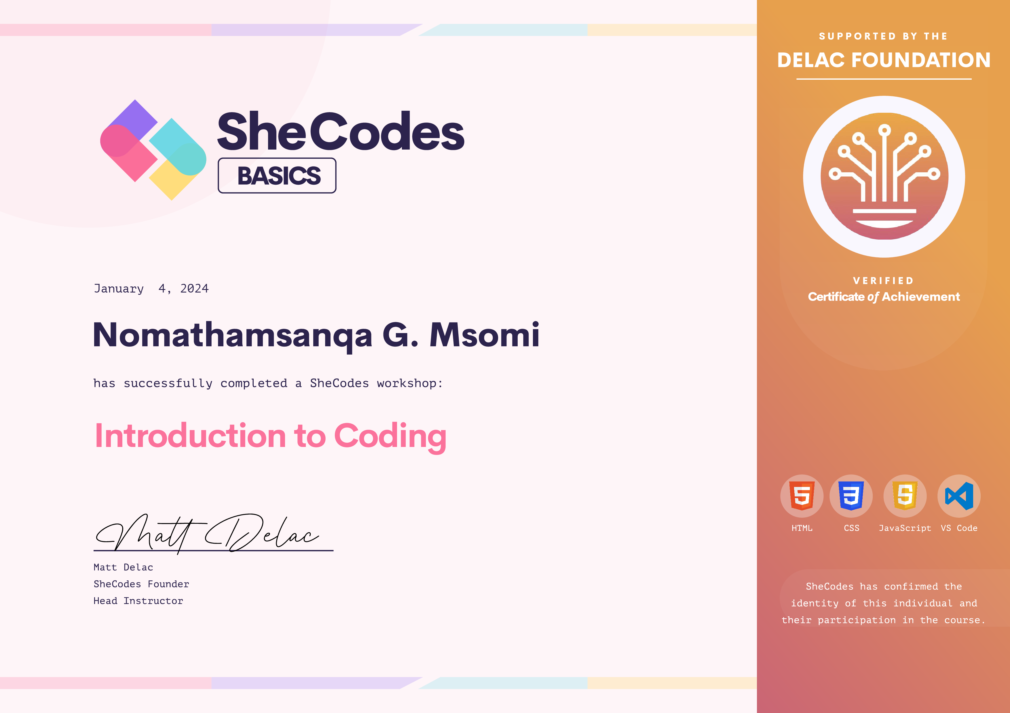 Nomathamsanqa G. has been fully supported by the Delac Foundation to complete this SheCodes Workshop