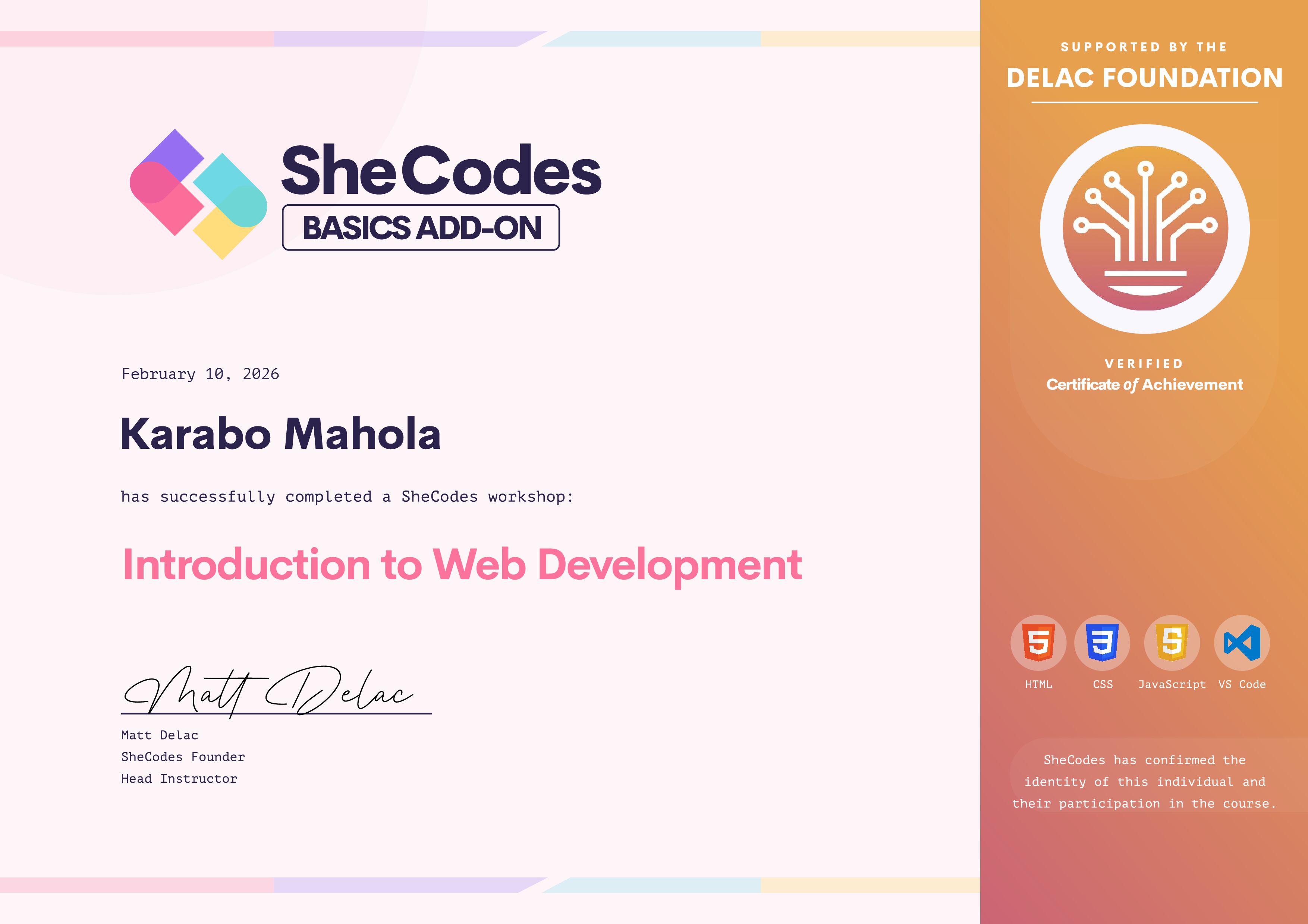 Karabo has been fully supported by the The Delac Foundation to complete this SheCodes Workshop