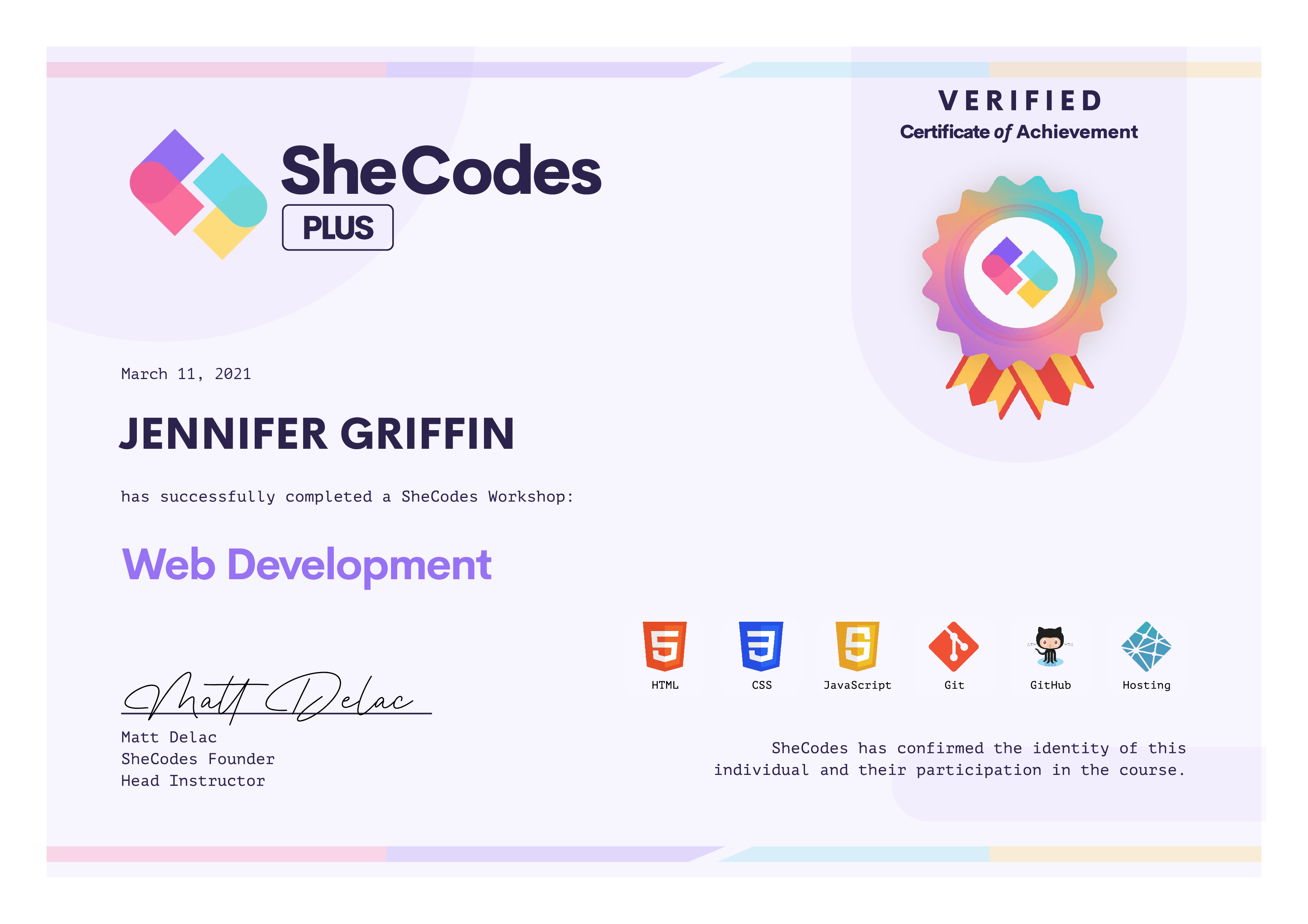 JENNIFER successfully graduated from at least one SheCodes Coding Workshop and is featured in the SheCodes Hall of Fame