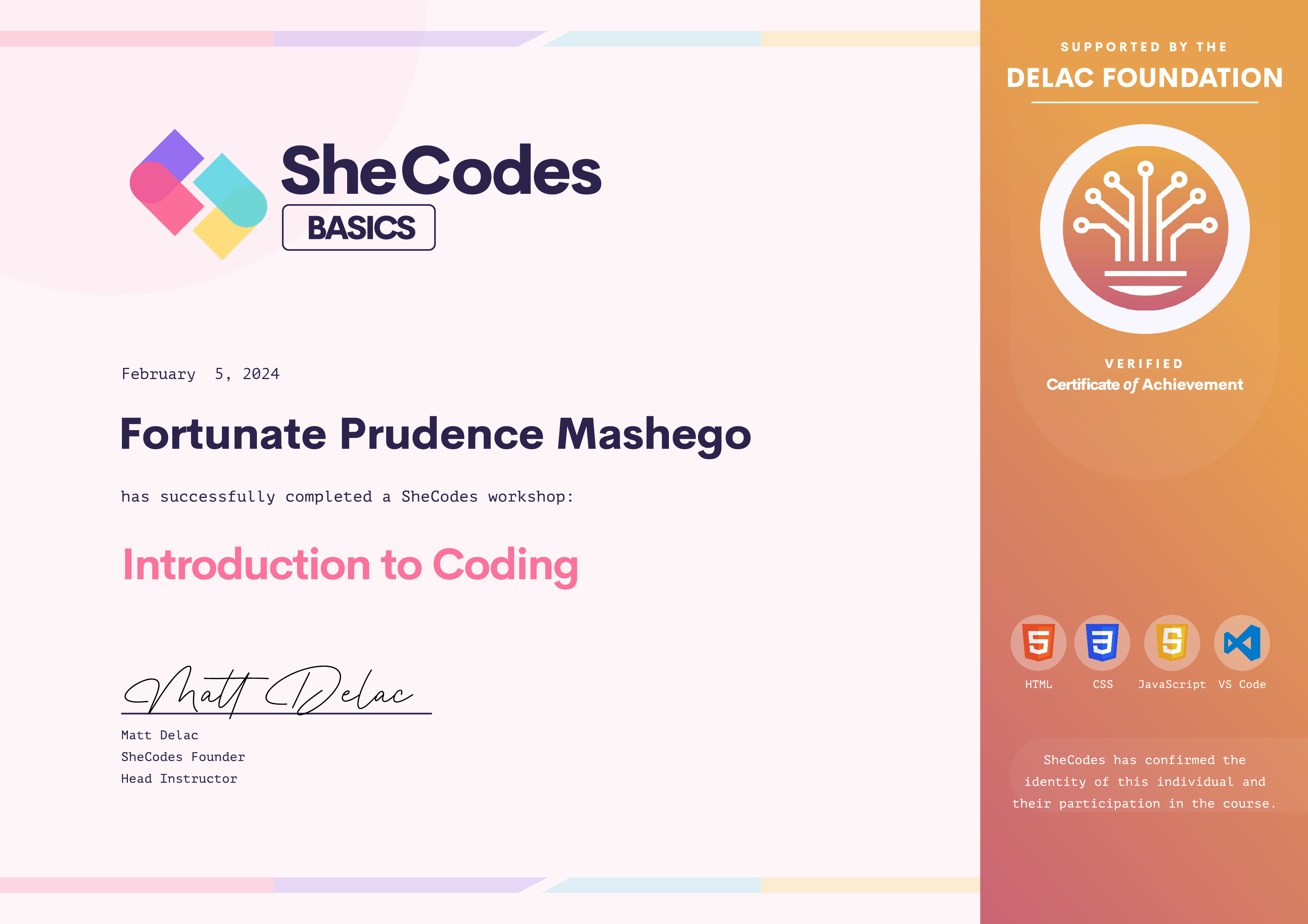 Fortunate Prudence has been fully supported by the Delac Foundation to complete this SheCodes Workshop