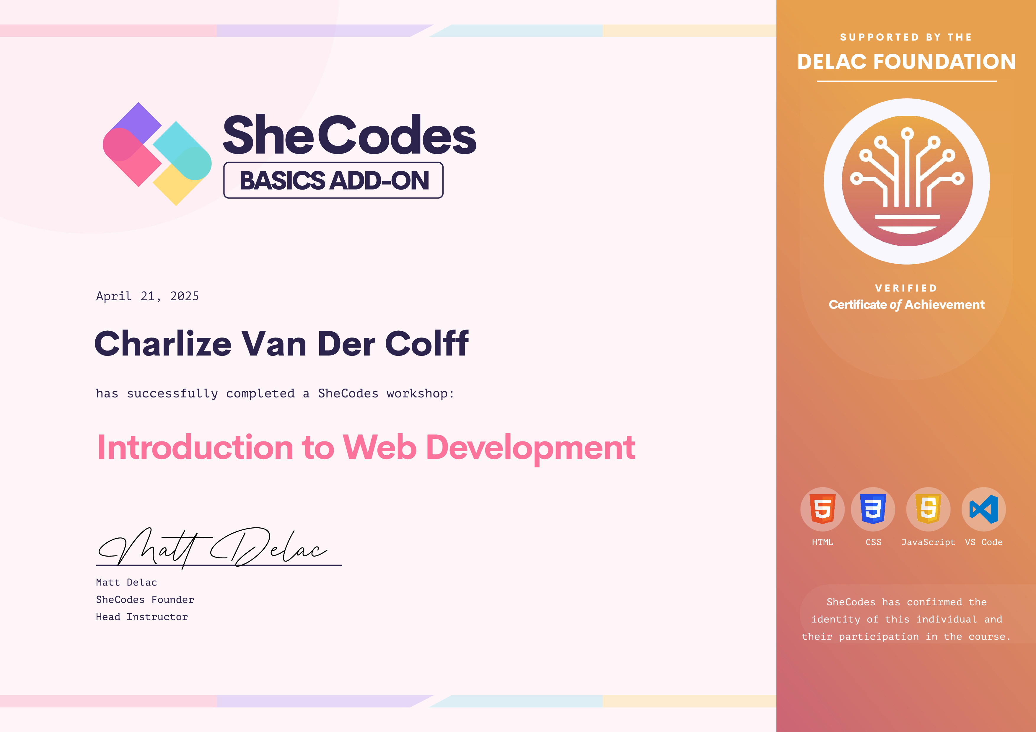 Charlize has been fully supported by the Delac Foundation to complete this SheCodes Workshop