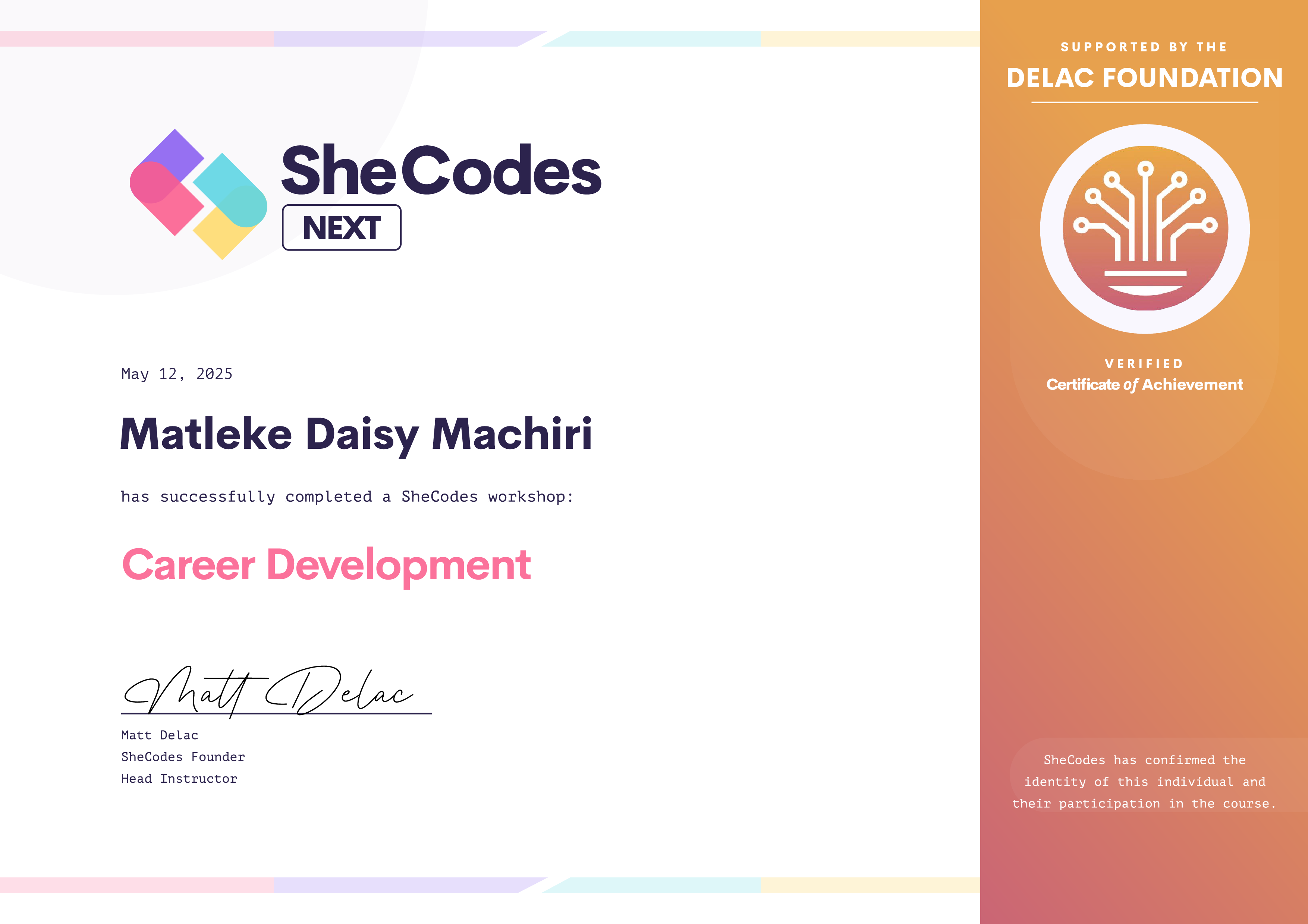 Matleke Daisy has been fully supported by the Delac Foundation to complete this SheCodes Workshop