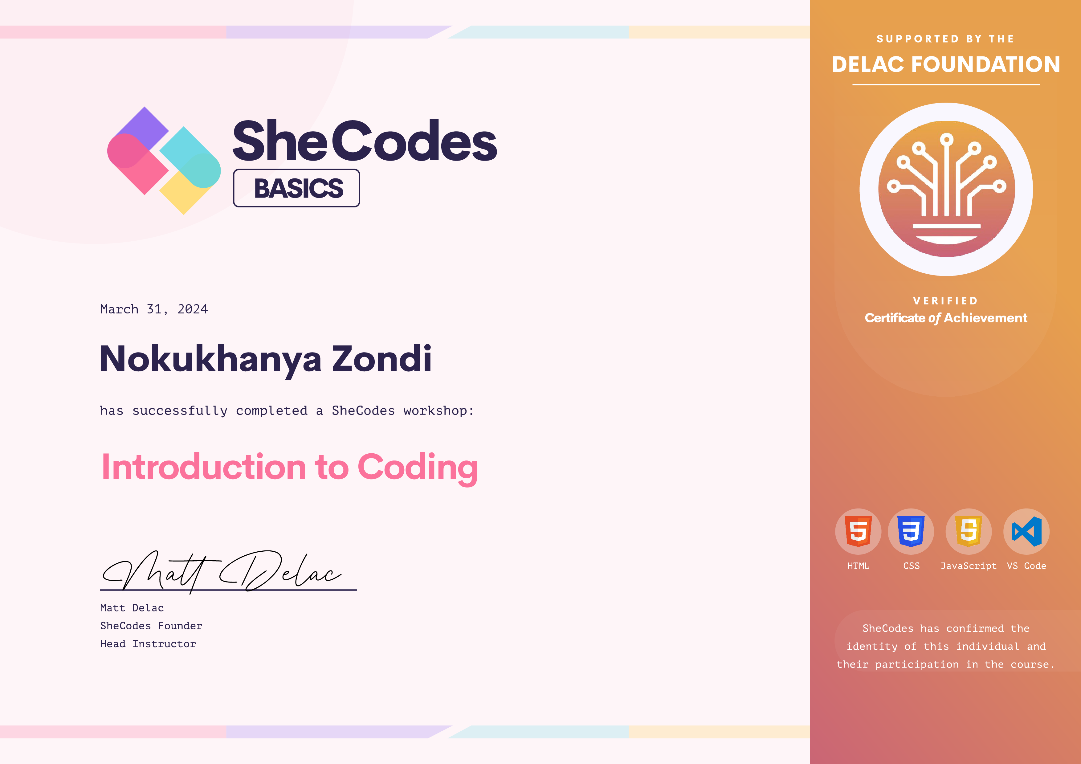 Nokukhanya has been fully supported by the Delac Foundation to complete this SheCodes Workshop