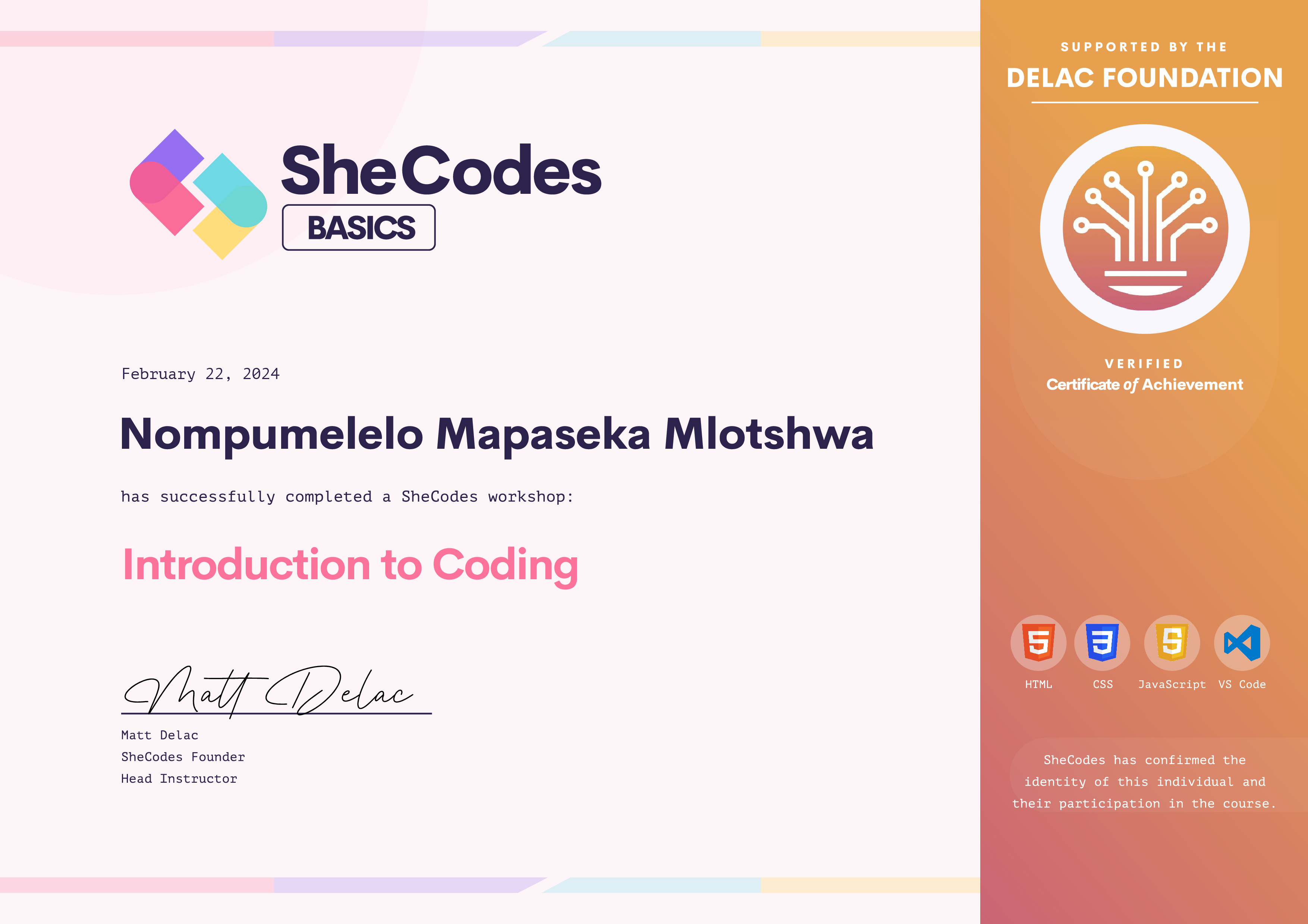Nompumelelo Mapaseka has been fully supported by the Delac Foundation to complete this SheCodes Workshop