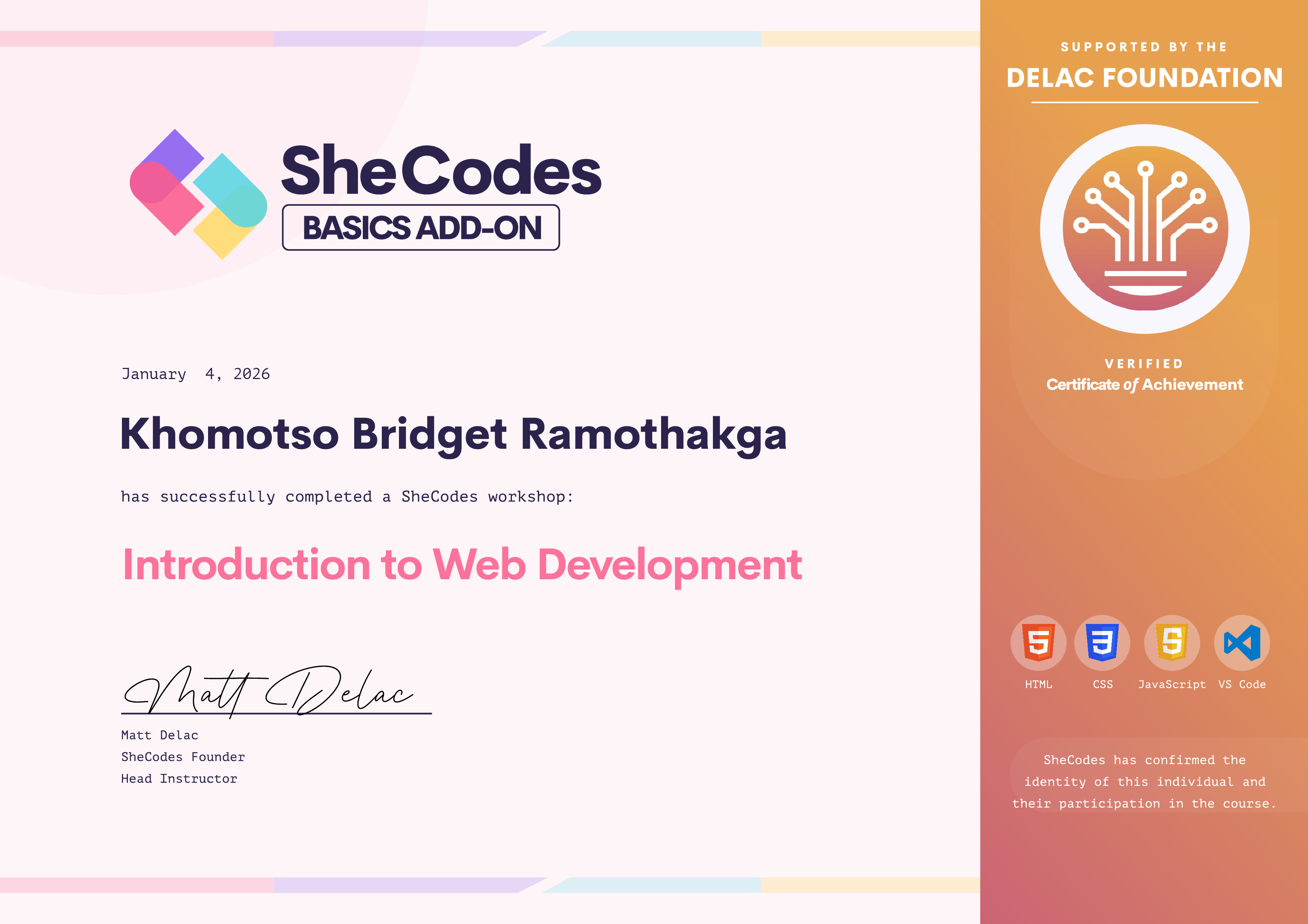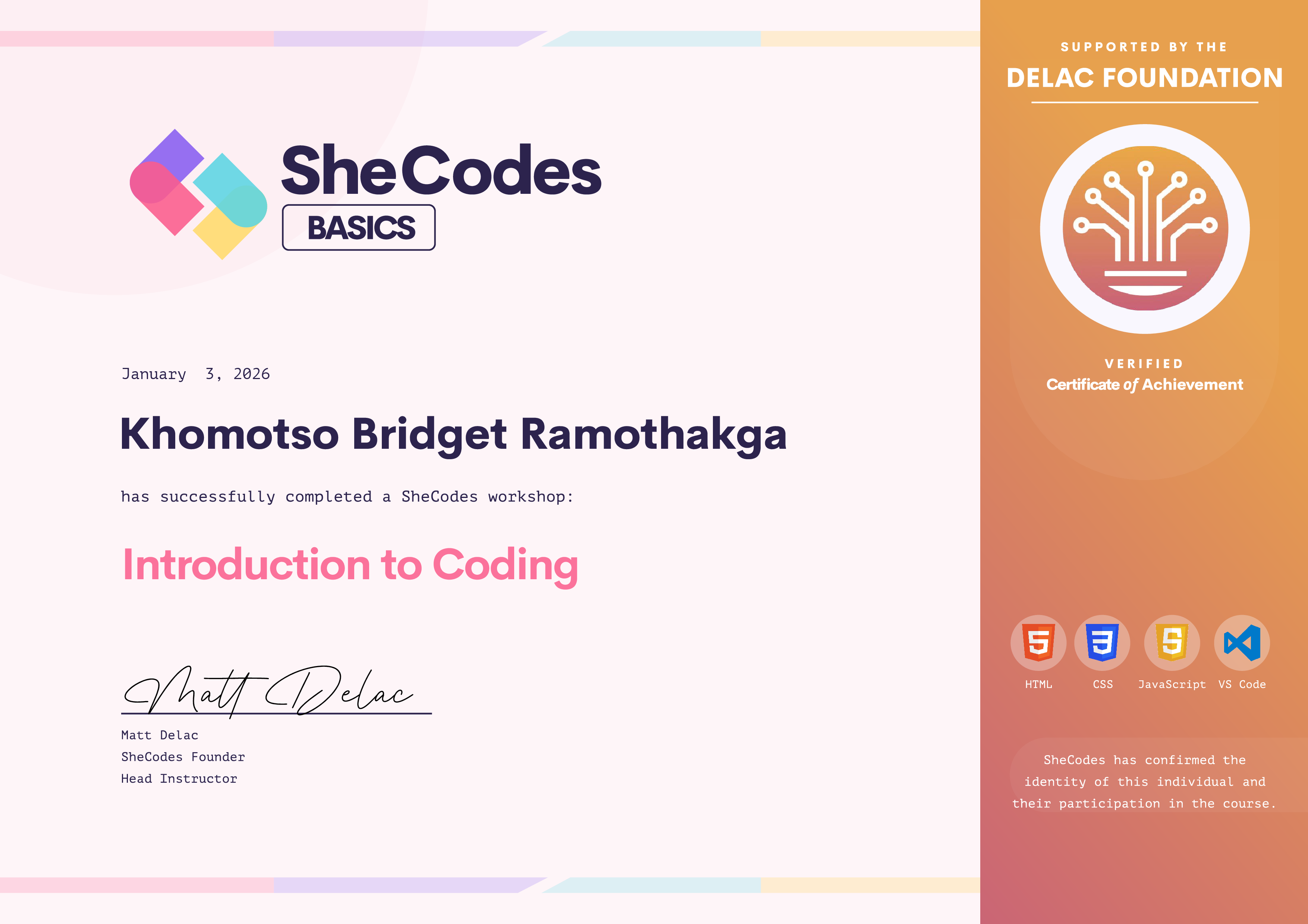 Khomotso Bridget has been fully supported by the Delac Foundation to complete this SheCodes Workshop