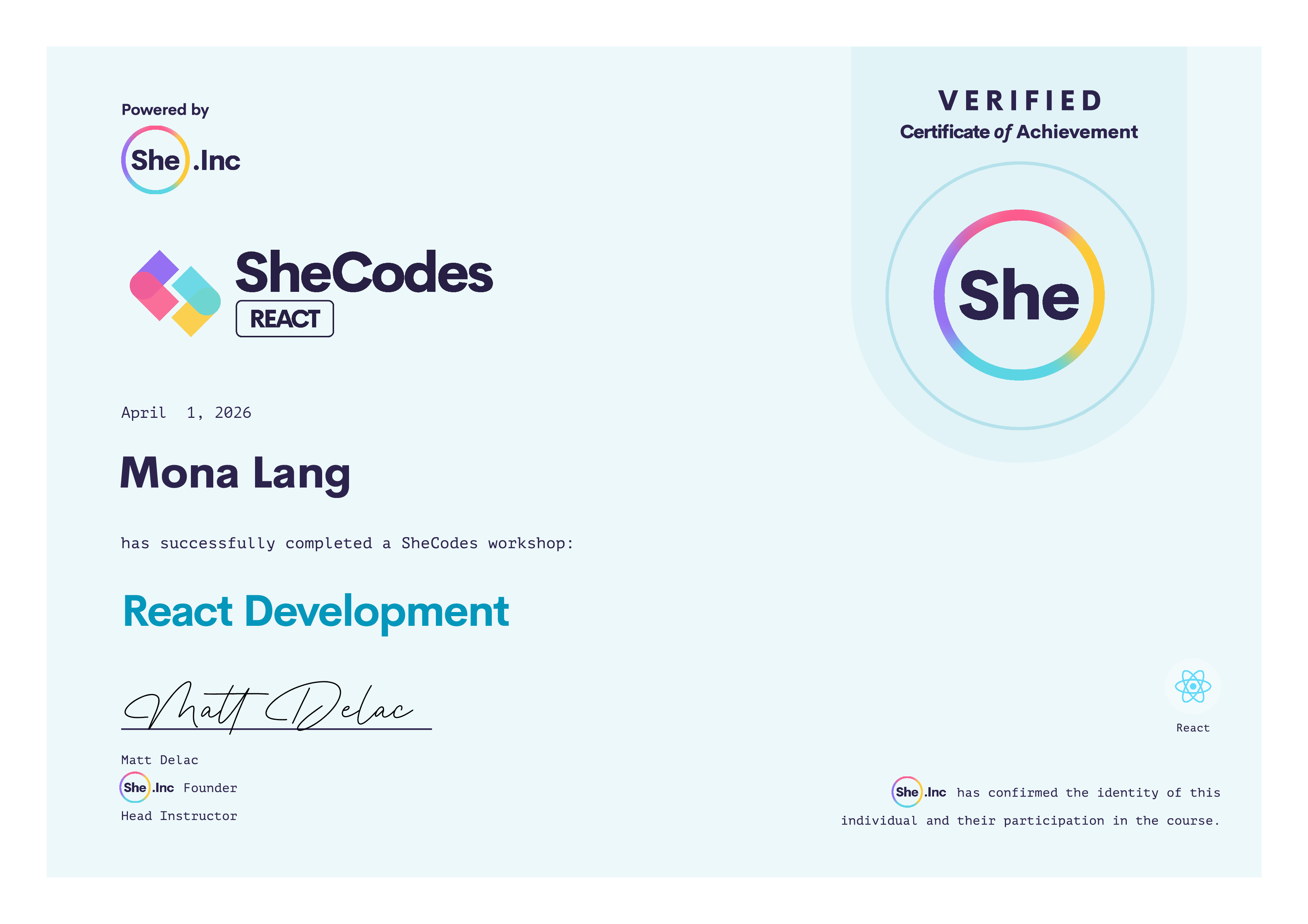 Mona successfully graduated from at least one SheCodes Coding Workshop and is featured in the SheCodes Hall of Fame