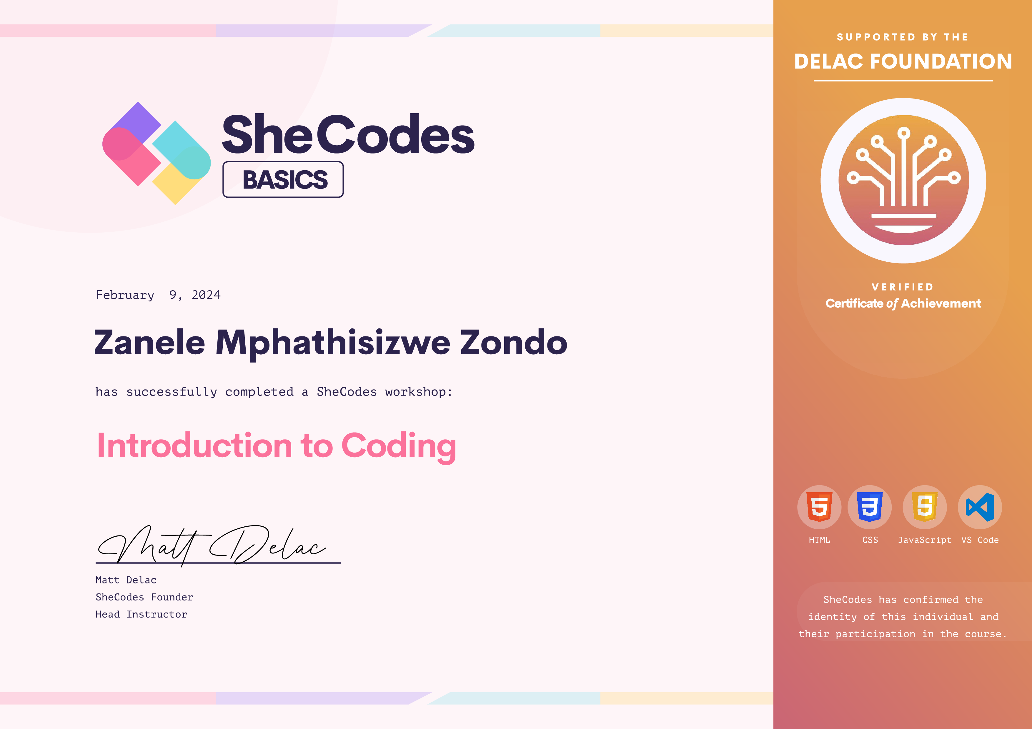 Zanele Mphathisizwe has been fully supported by the Delac Foundation to complete this SheCodes Workshop