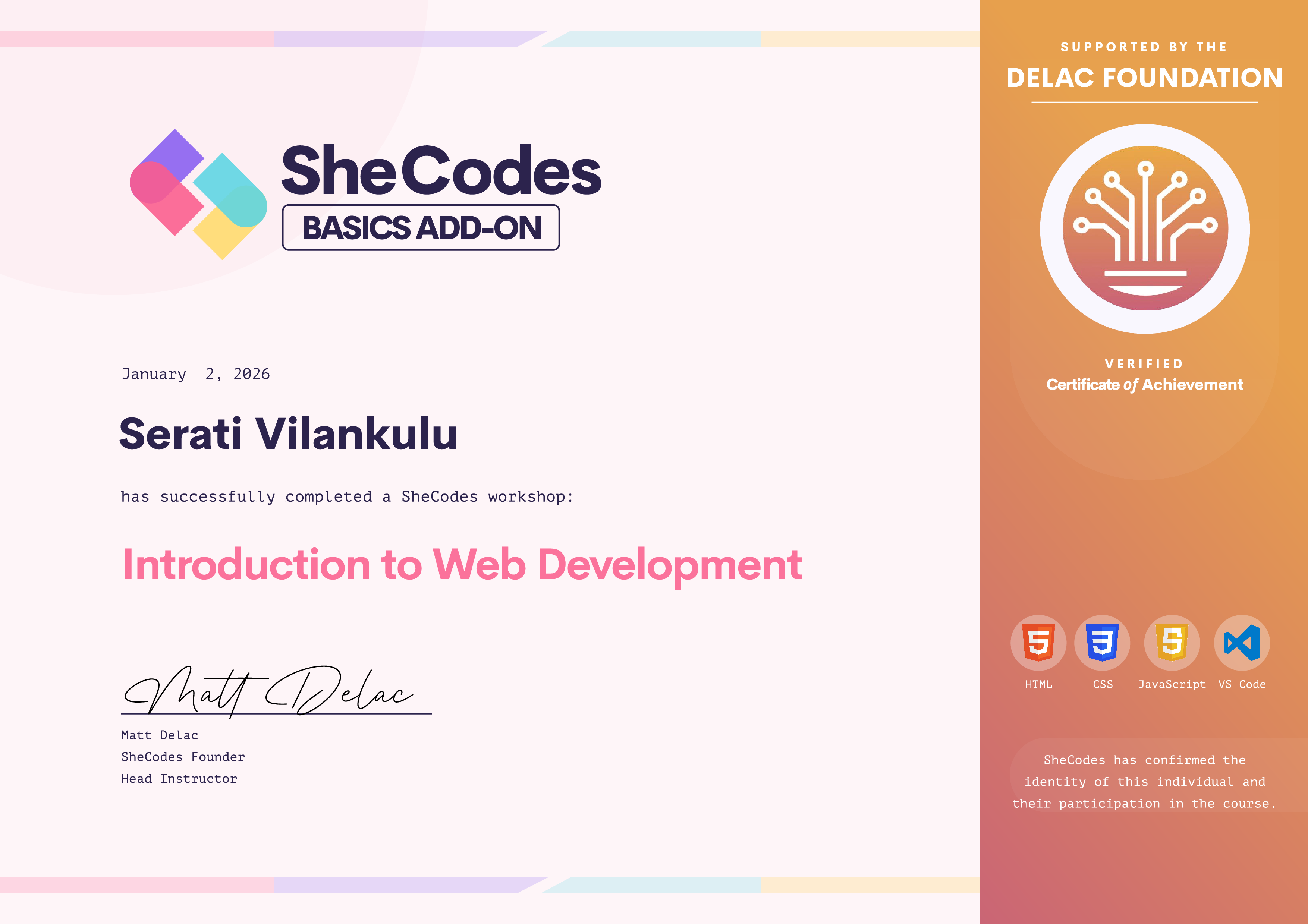 Serati has been fully supported by the Delac Foundation to complete this SheCodes Workshop