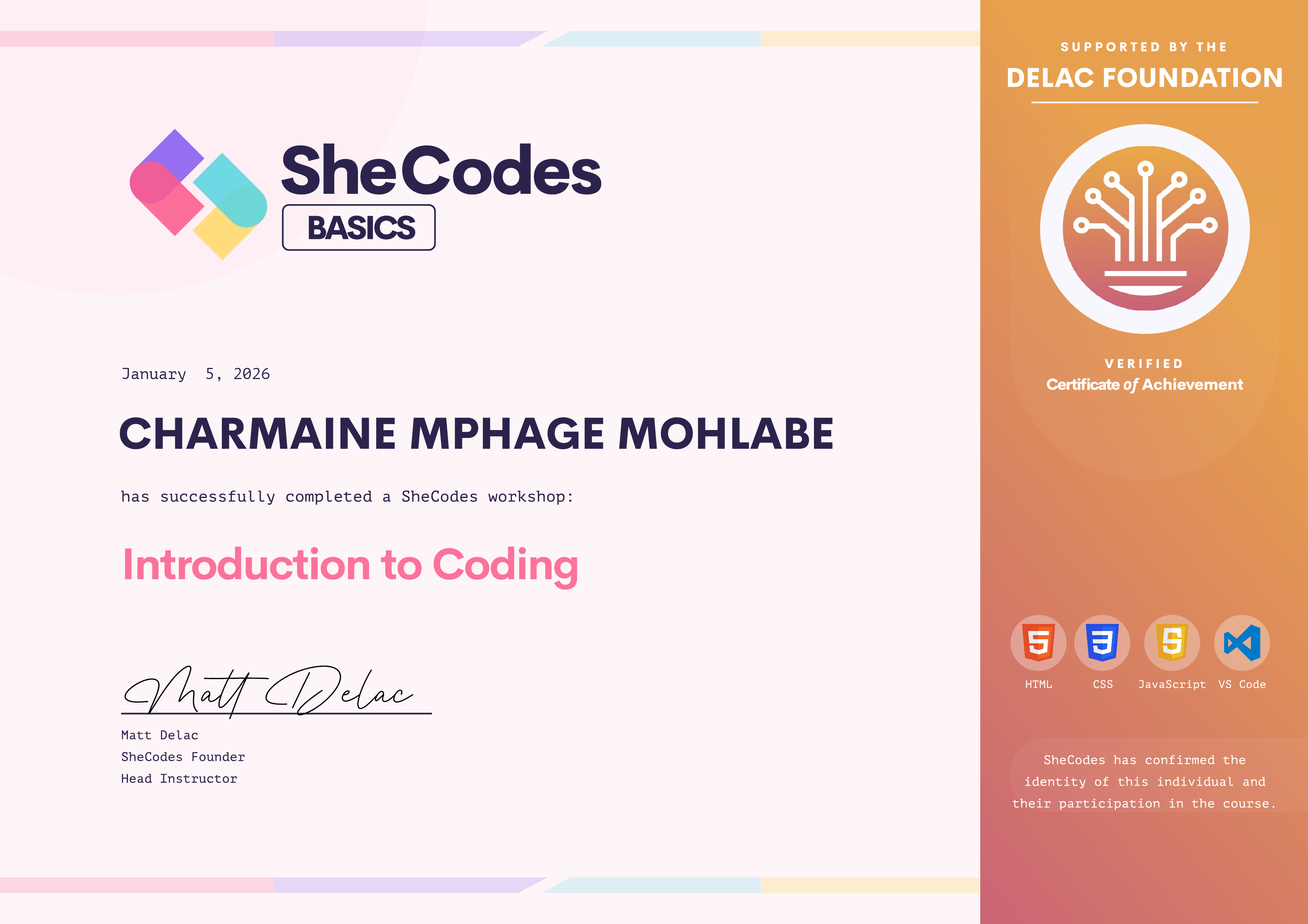 CHARMAINE MPHAGE has been fully supported by the Delac Foundation to complete this SheCodes Workshop