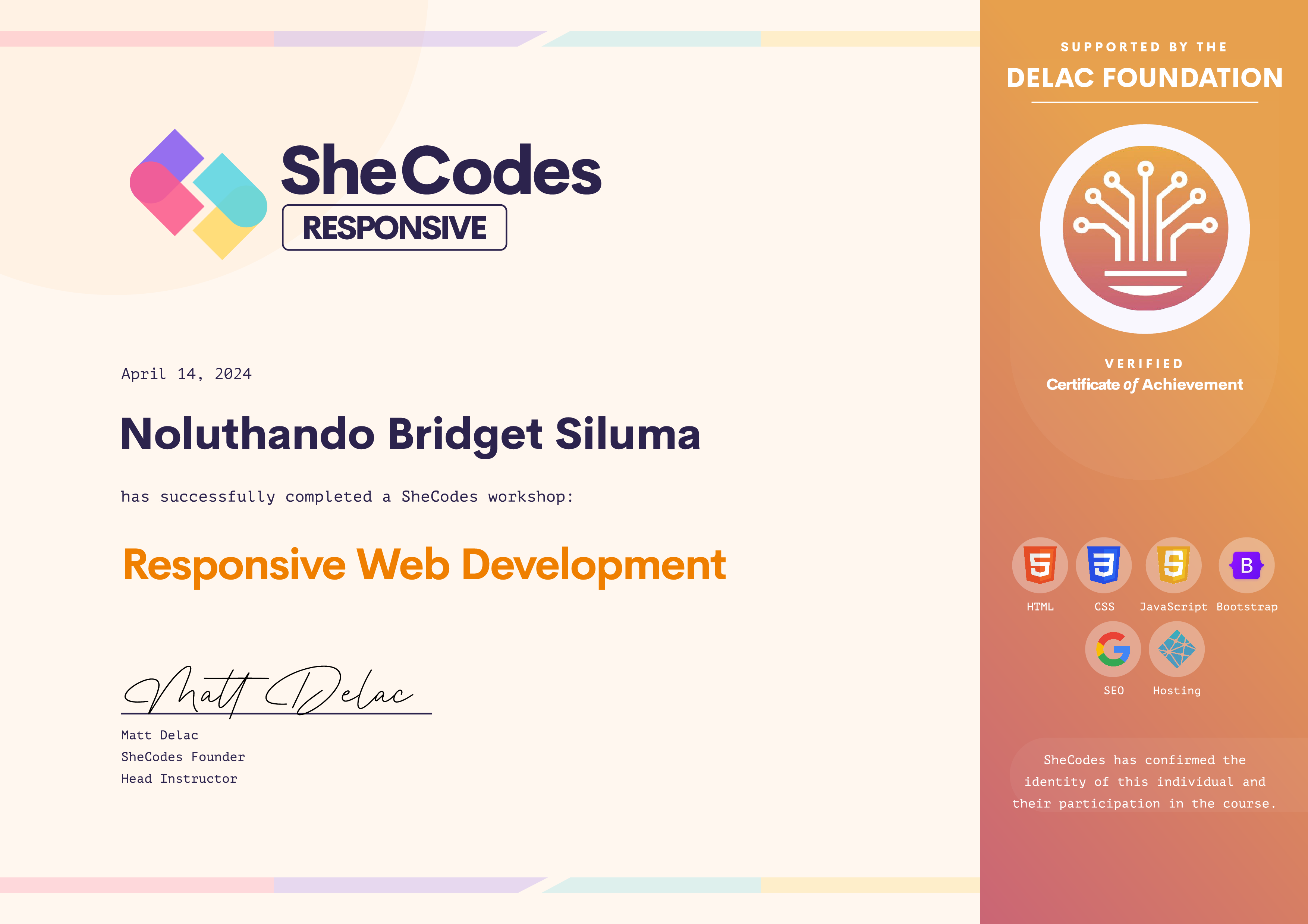 Noluthando Bridget has been fully supported by the Delac Foundation to complete this SheCodes Workshop