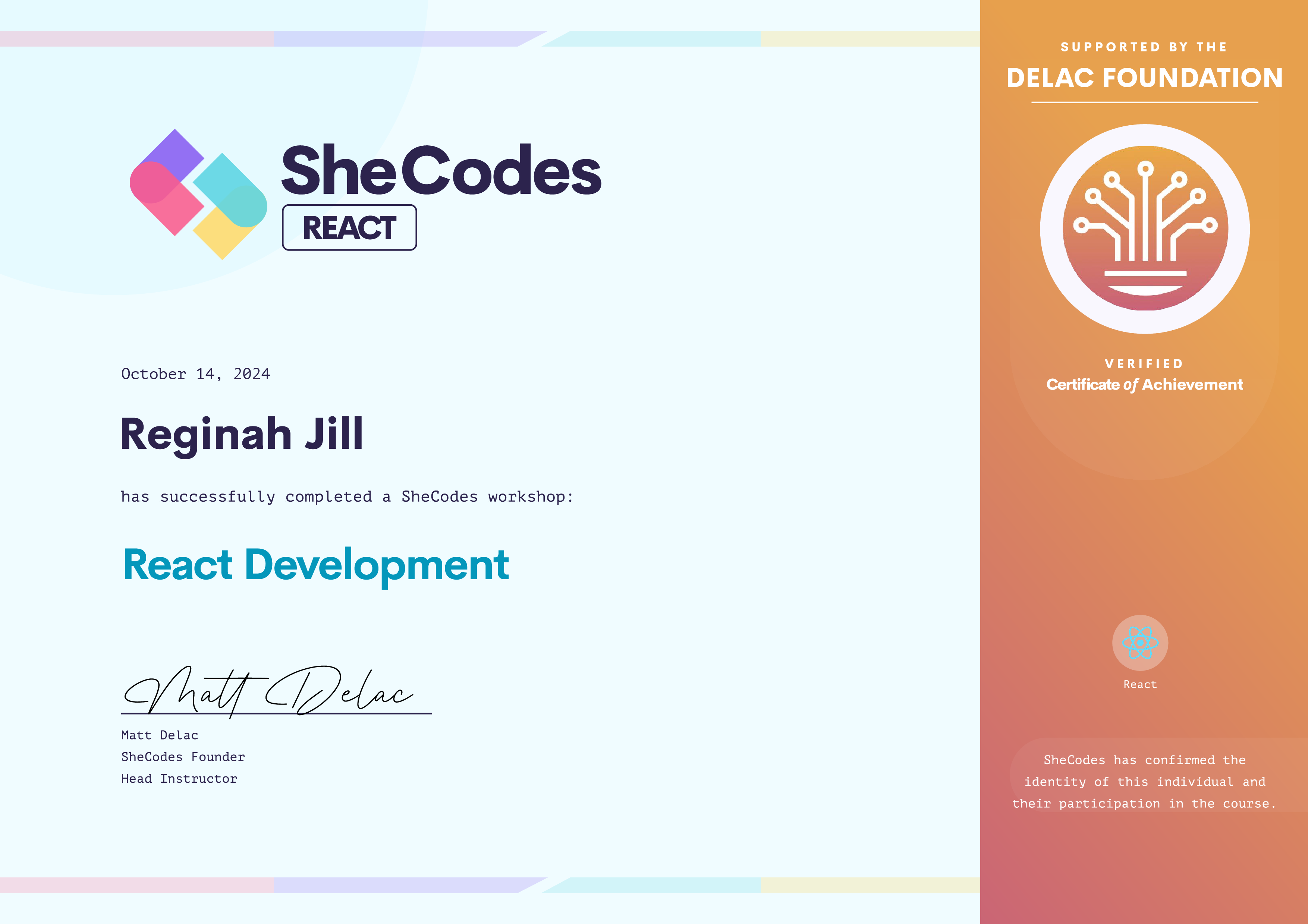 Reginah has been fully supported by the Delac Foundation to complete this SheCodes Workshop