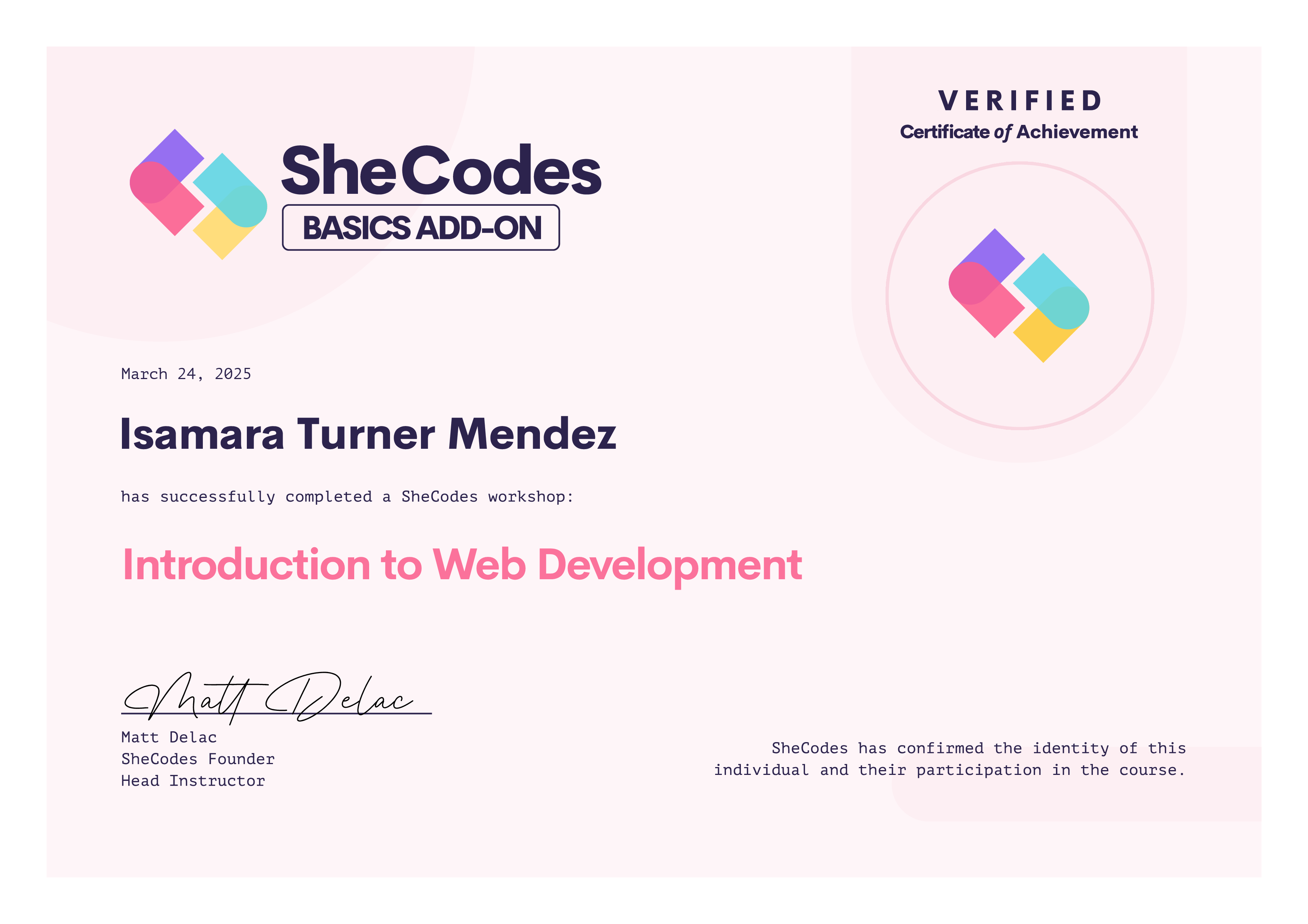 Isamara successfully graduated from at least one SheCodes Coding Workshop and is featured in the SheCodes Hall of Fame