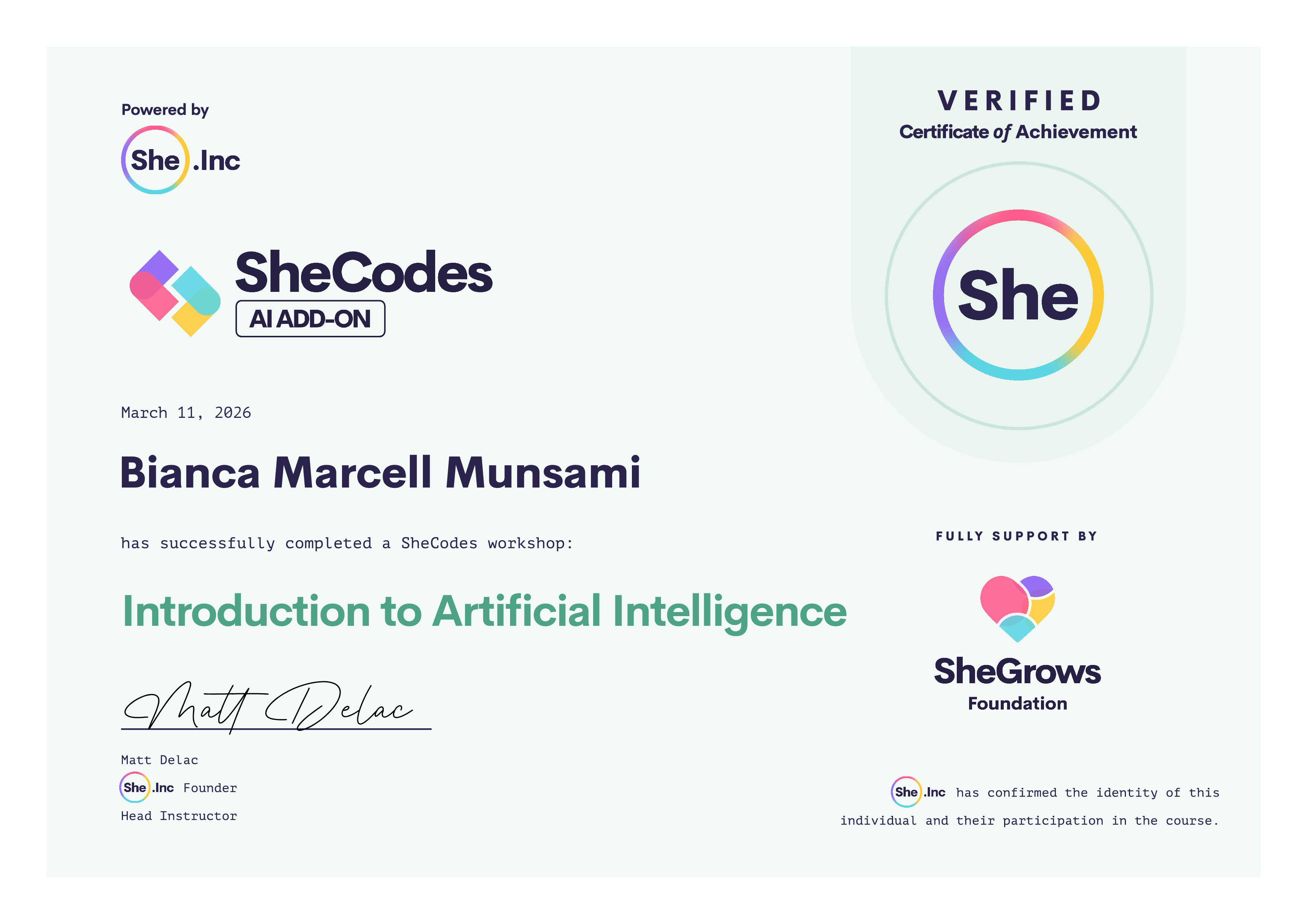 Bianca Marcell has been fully supported by the The SheGrows Foundation to complete this SheCodes Workshop