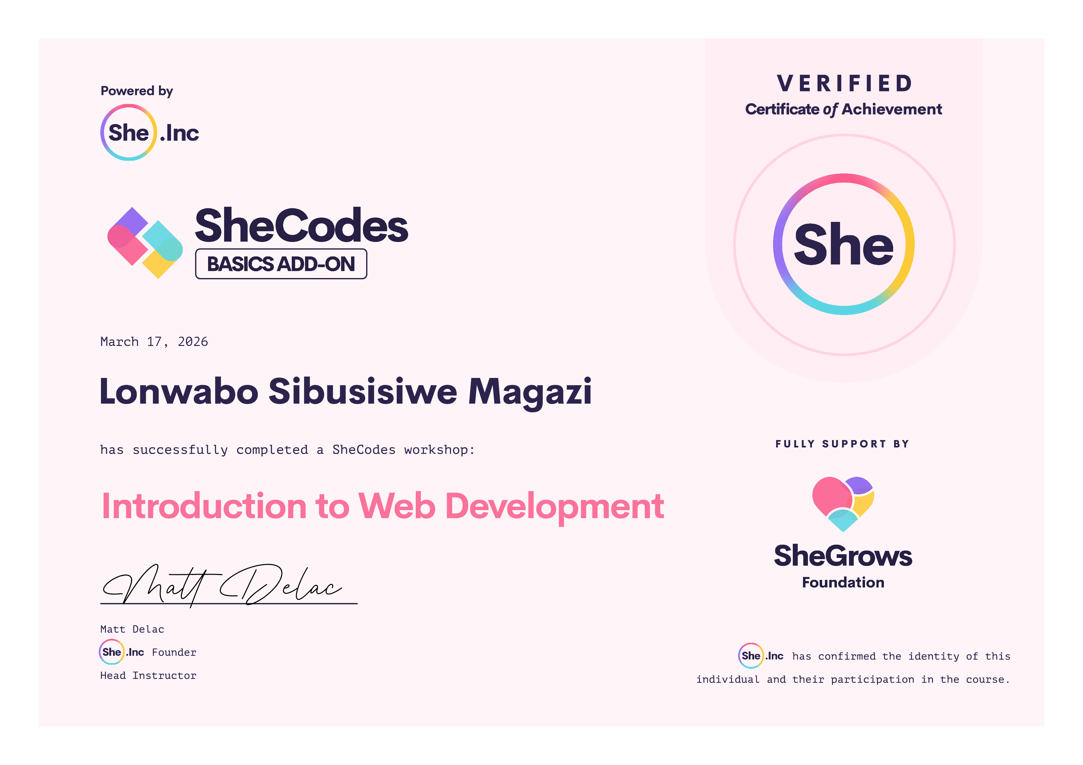 Lonwabo Sibusisiwe has been fully supported by the The Delac Foundation to complete this SheCodes Workshop