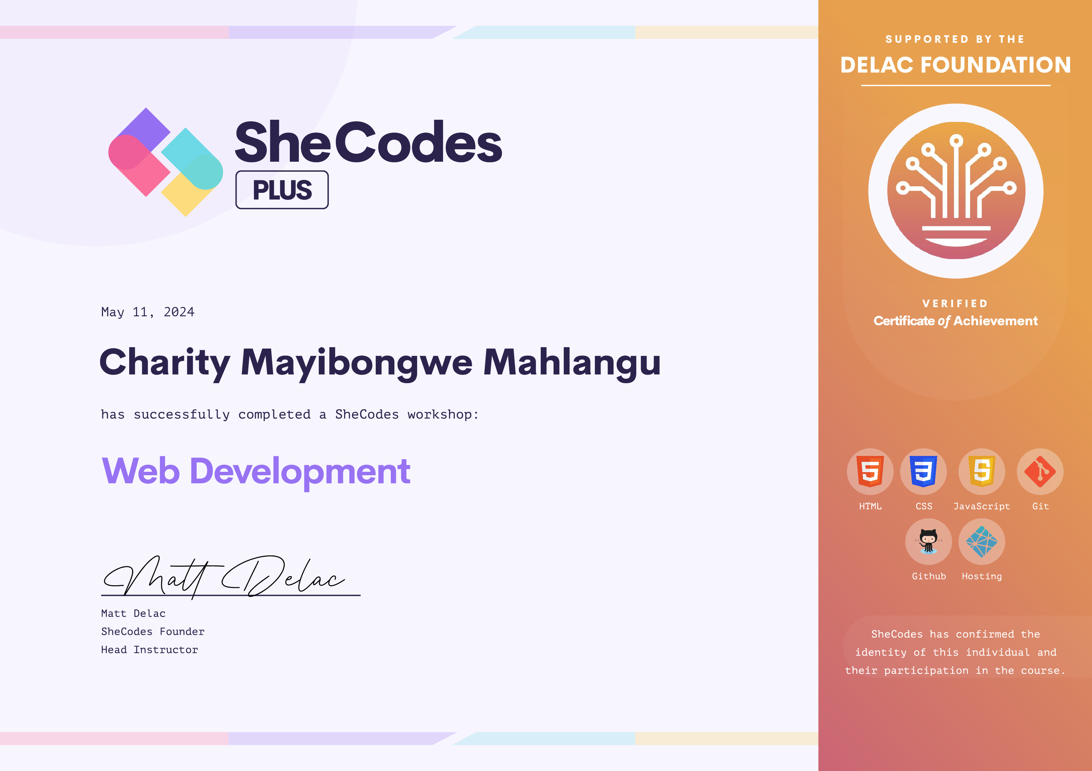 Charity Mayibongwe has been fully supported by the Delac Foundation to complete this SheCodes Workshop