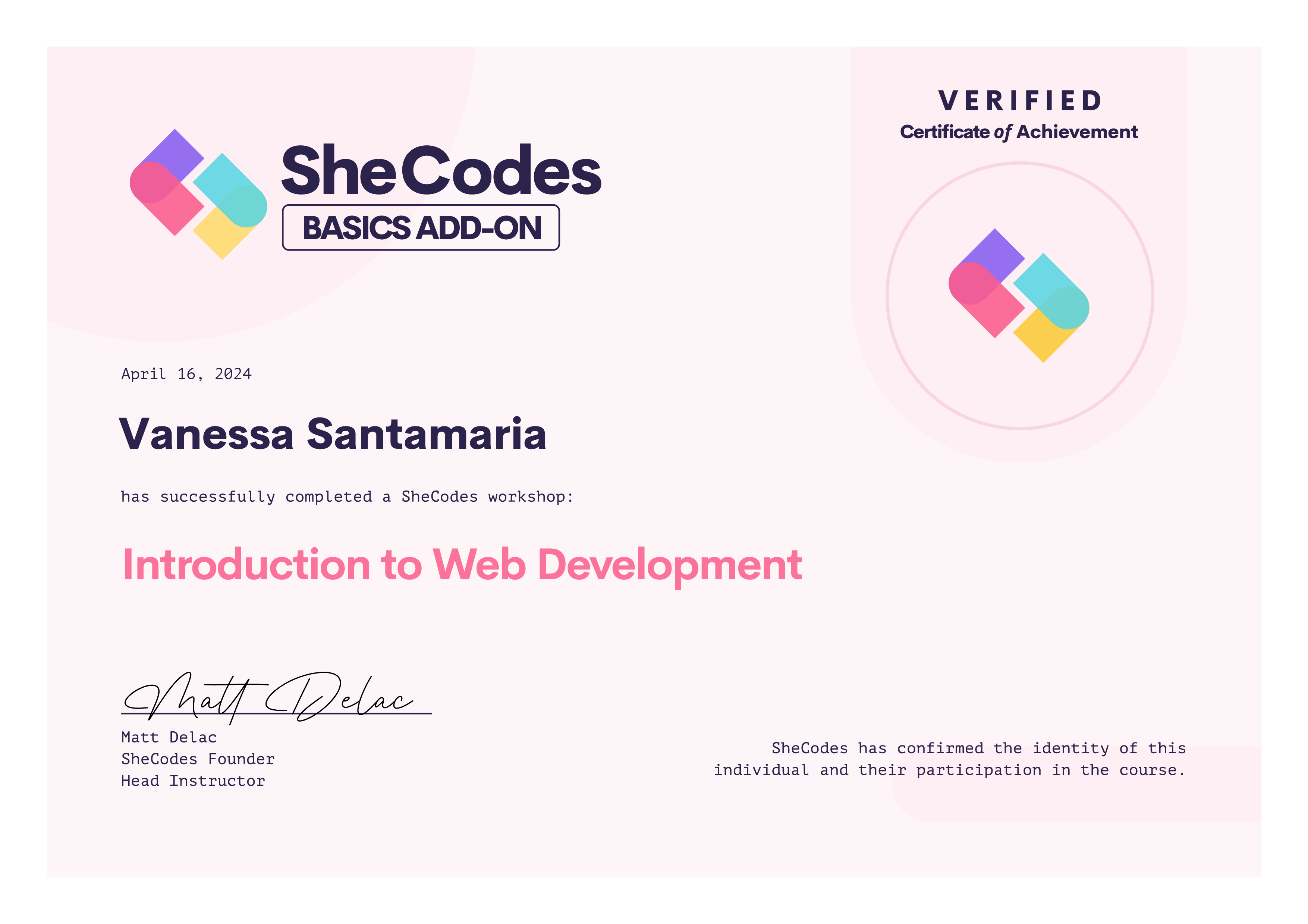 Vanessa successfully graduated from at least one SheCodes Coding Workshop and is featured in the SheCodes Hall of Fame